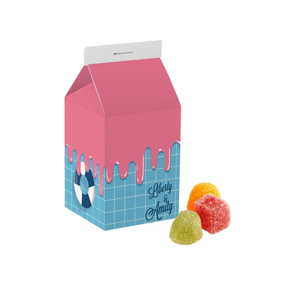 Elevate your promotional efforts with these compact milk cartons filled with a delightful mix of licorice sticks. Each carton holds approximately 170 grams of assorted licorice, packaged in durable carton material for a premium feel.