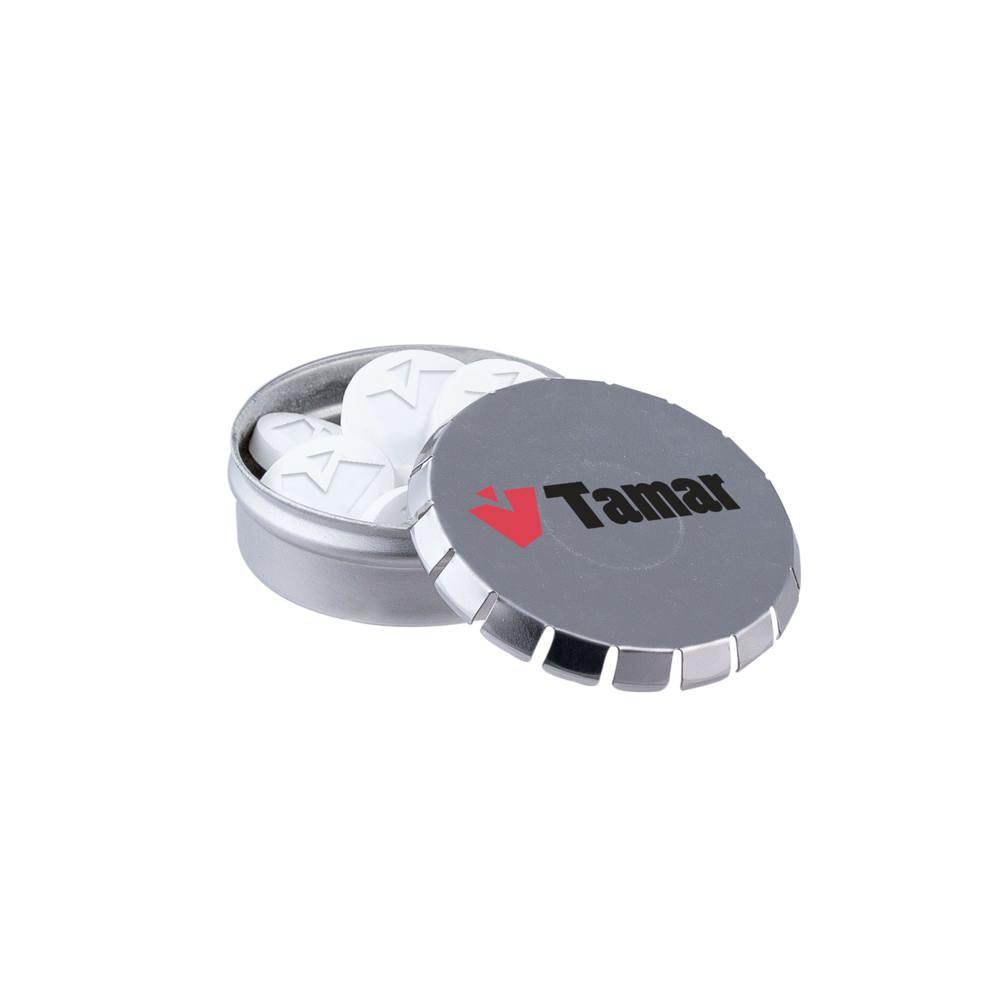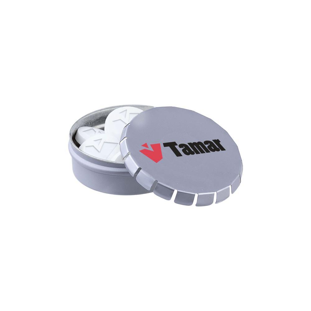 Elevate your promotional giveaways with this compact mini clic-clac tin, expertly filled with approximately 23 grams of shaped mints. Measuring just 57 mm in diameter, it fits effortlessly into pockets, purses, or event goodie bags, ensuring your brand stays visible long after the event.