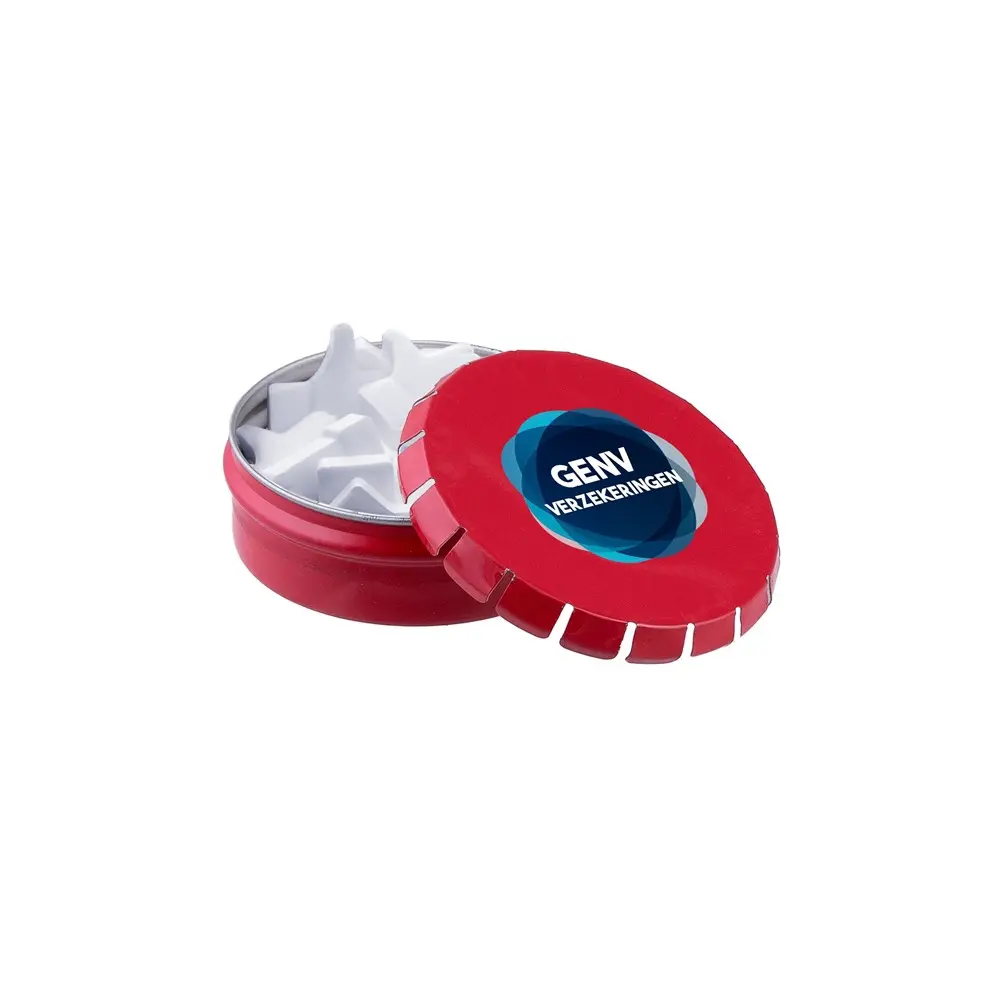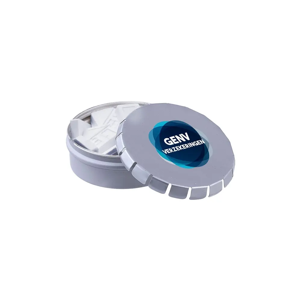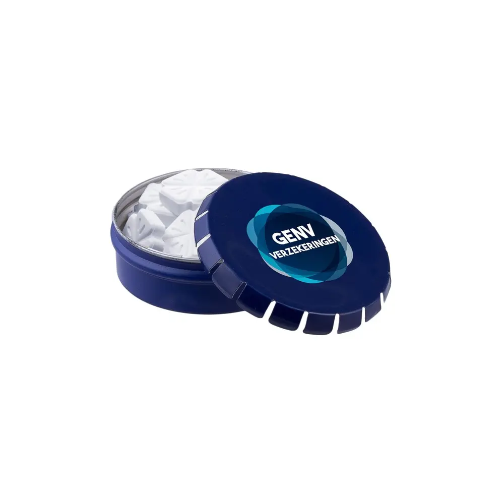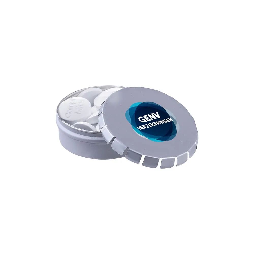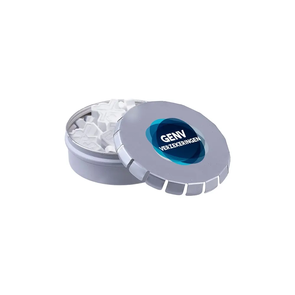 Elevate your brand's visibility with our Mini Clic-Clac Tin with Shape, a compact promotional essential crafted from durable tin (diameter: 57mm). Filled with approximately 23g of fresh Compli'mints, this tin includes an ingredients sticker and secure seal for quality assurance.