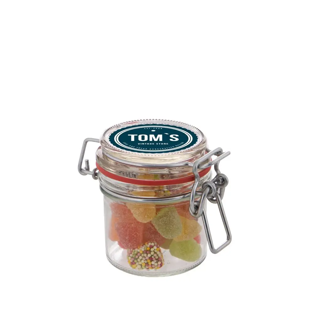 These compact glass jars hold 0.13 liters of candy, topped with a full-color printed sticker on the lid for easy customization. Crafted from durable glass with a 60mm diameter, they make a sweet addition to your branding efforts.