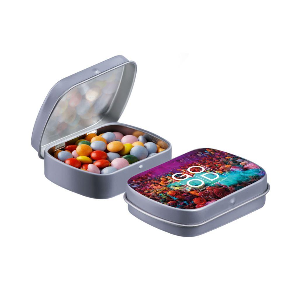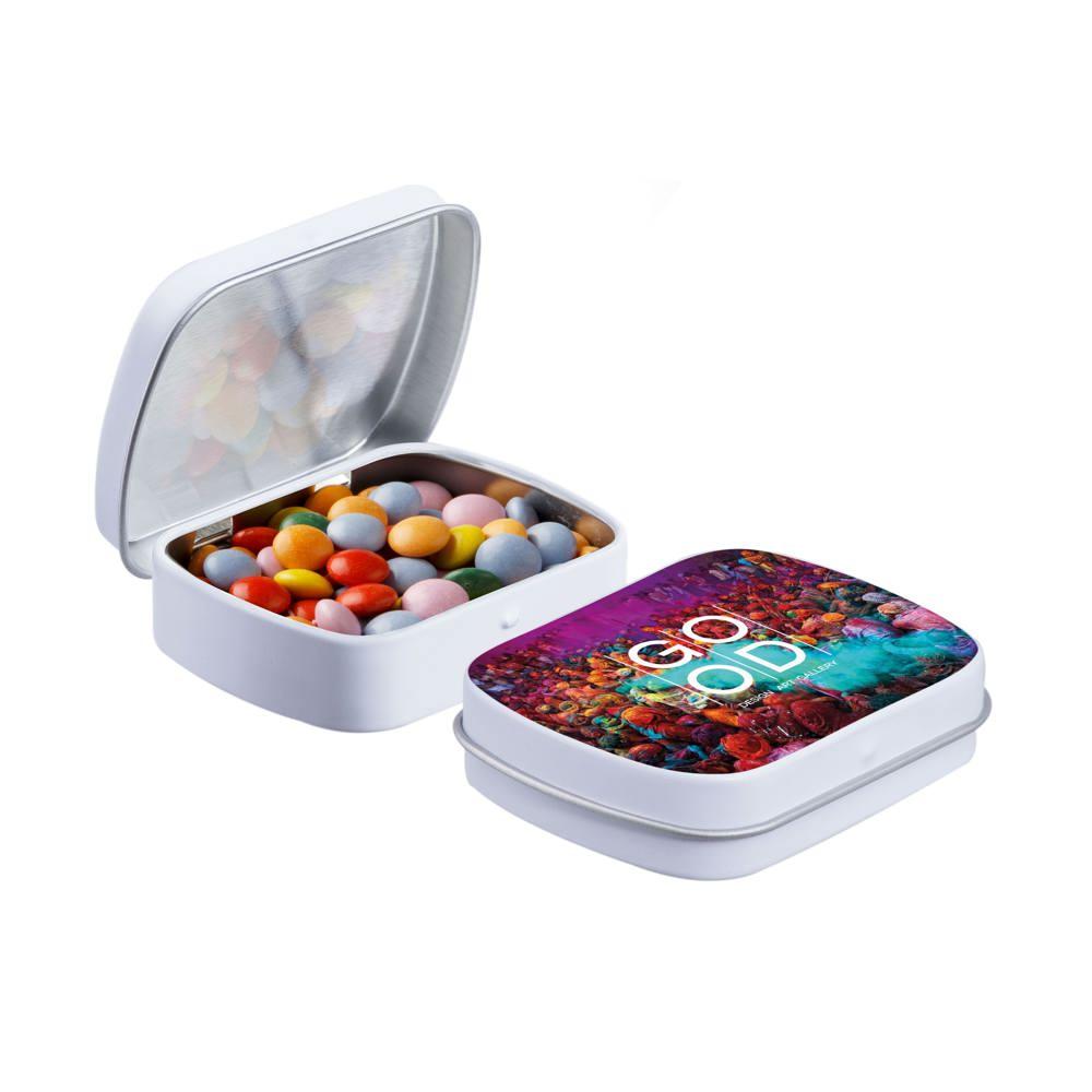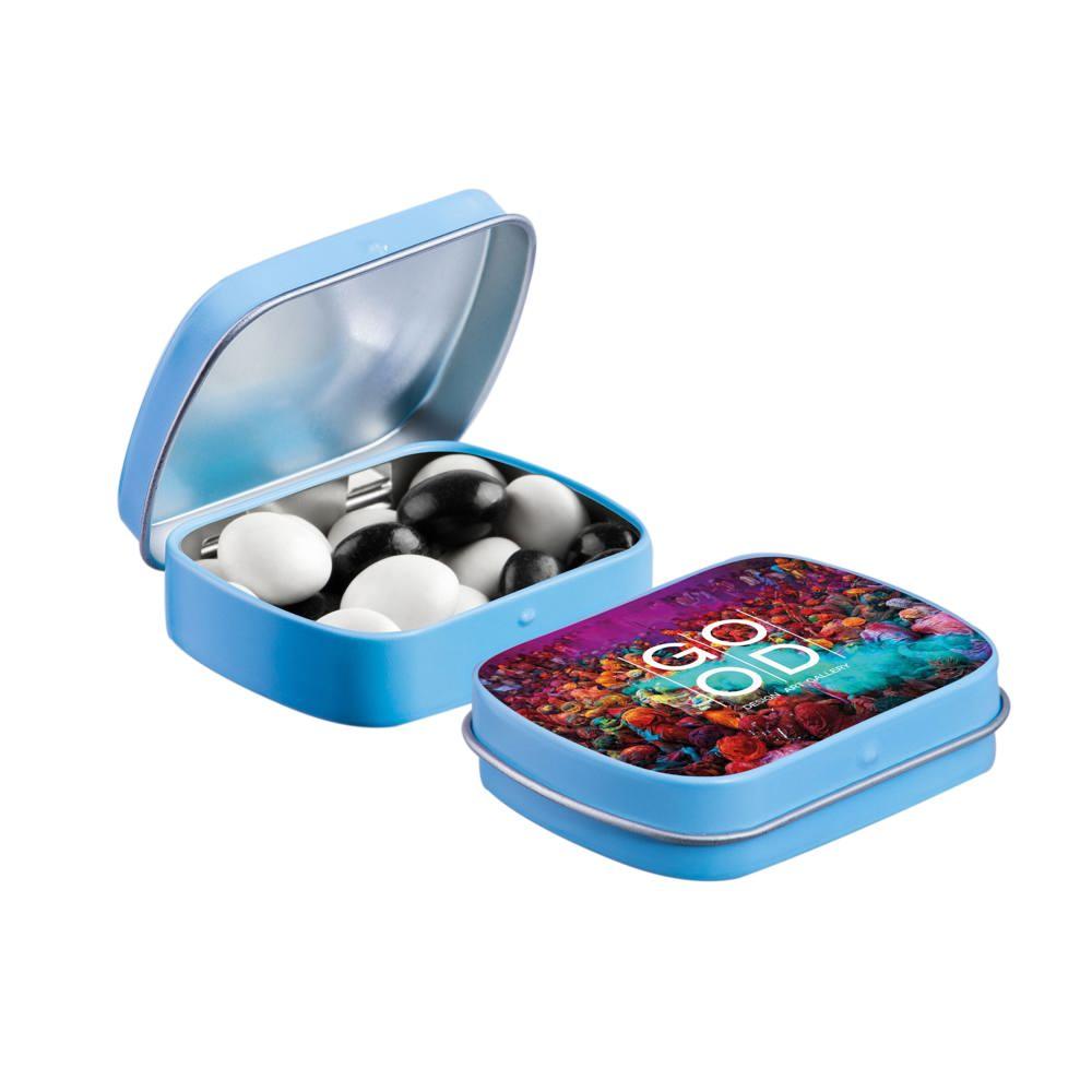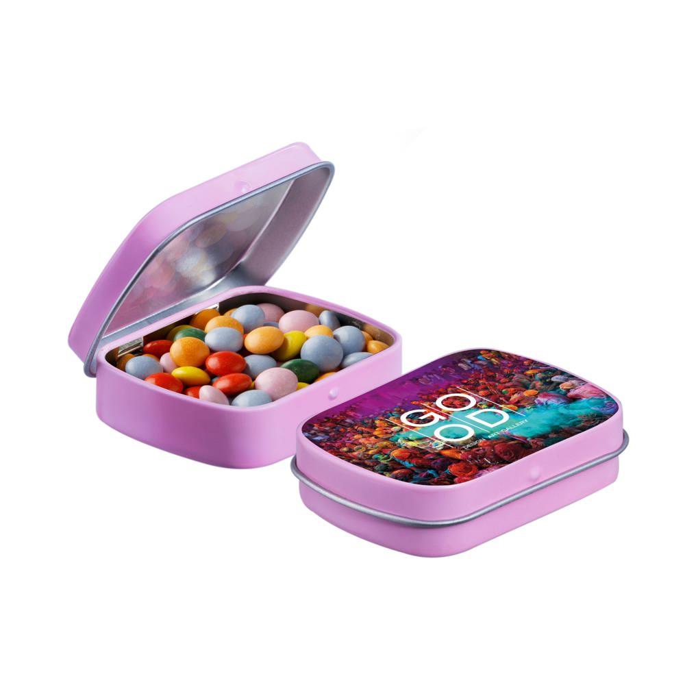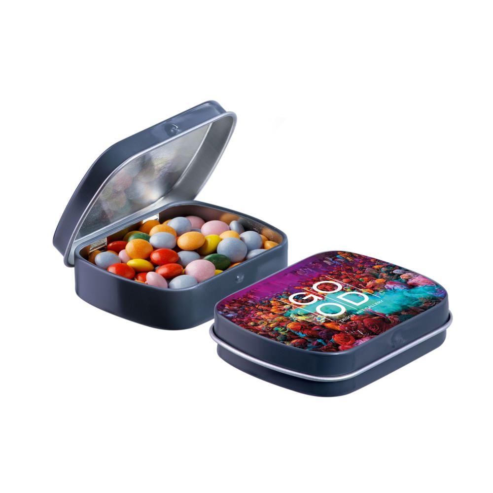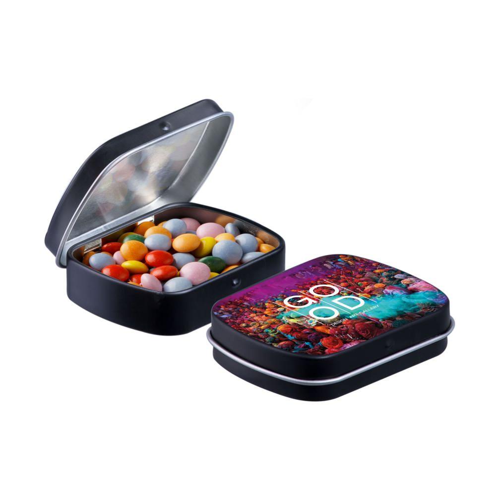 Elevate your brand with our Mini Hinge Tin with Candy, packed with approximately 23 grams of irresistible Mini Choco's. Personalize it with your full-color logo print for eye-catching promotion that delights recipients and boosts visibility.