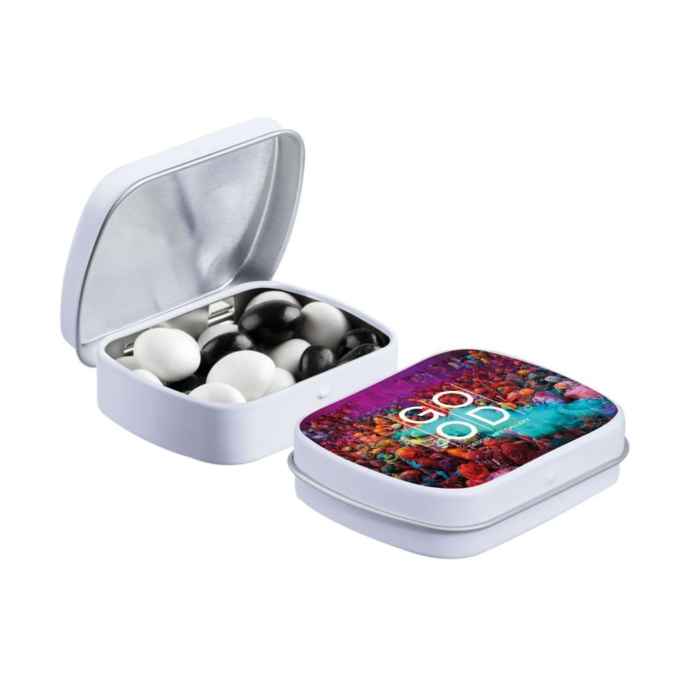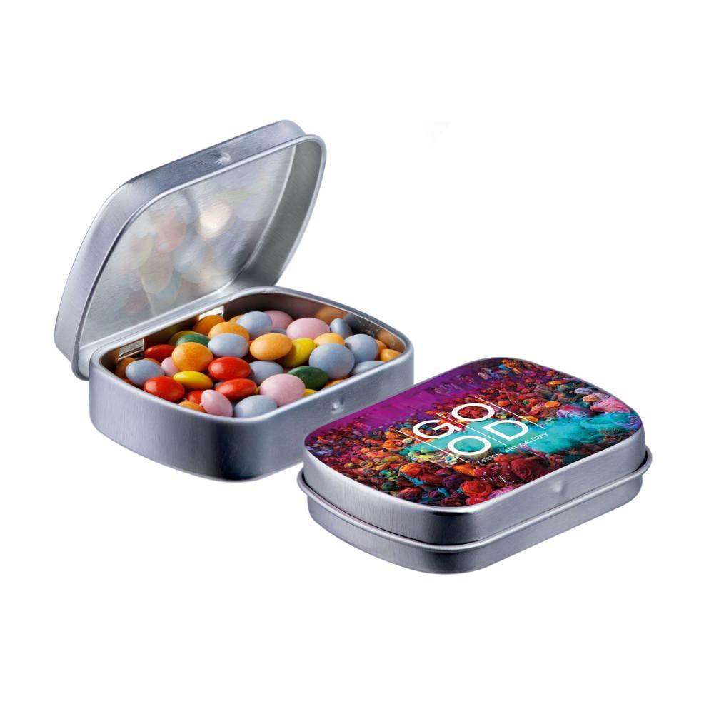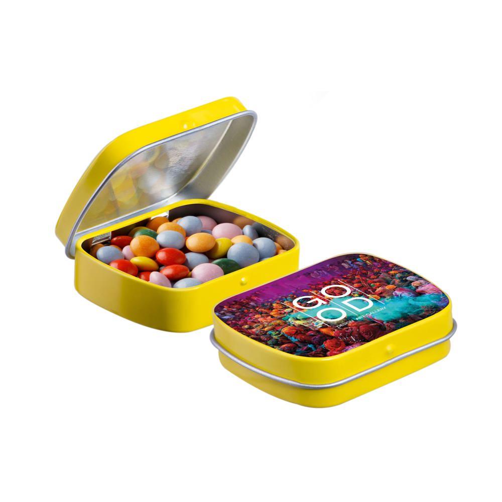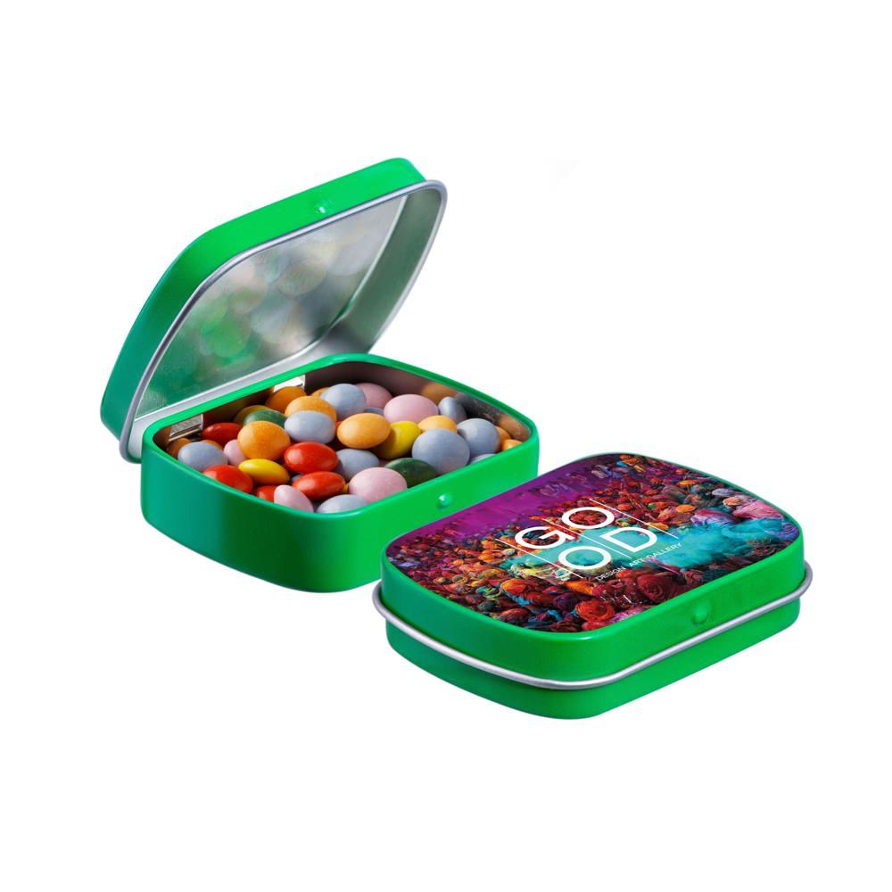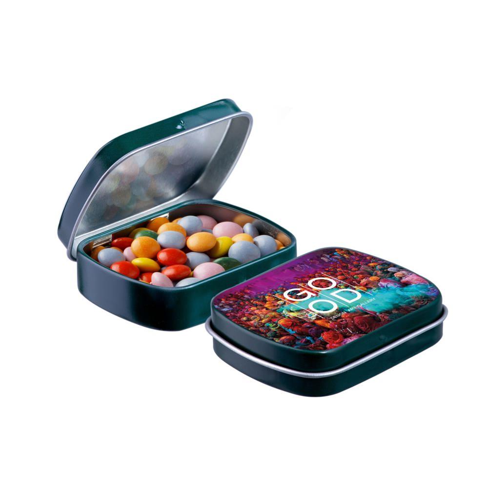 Elevate your brand with our Mini Hinge Tin with Candy, packed with approximately 23 grams of irresistible Mini Choco's. Personalize it with your full-color logo print for eye-catching promotion that delights recipients and boosts visibility.
