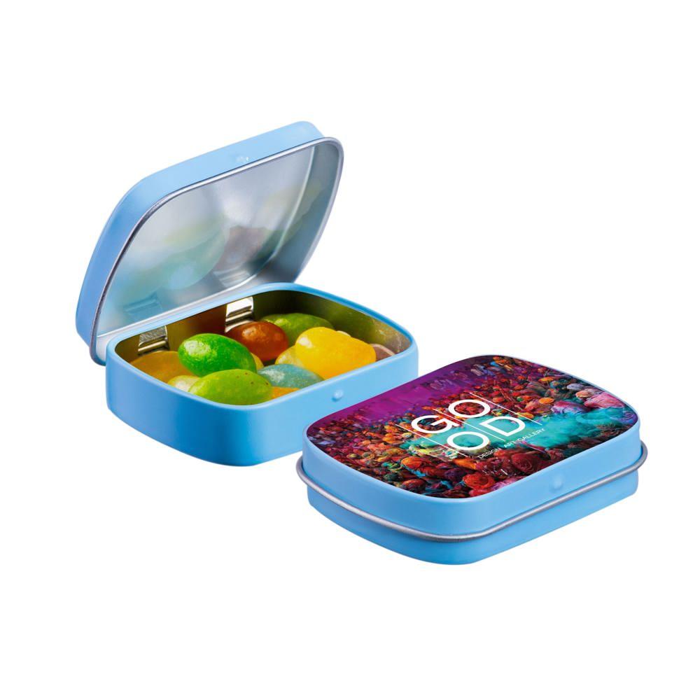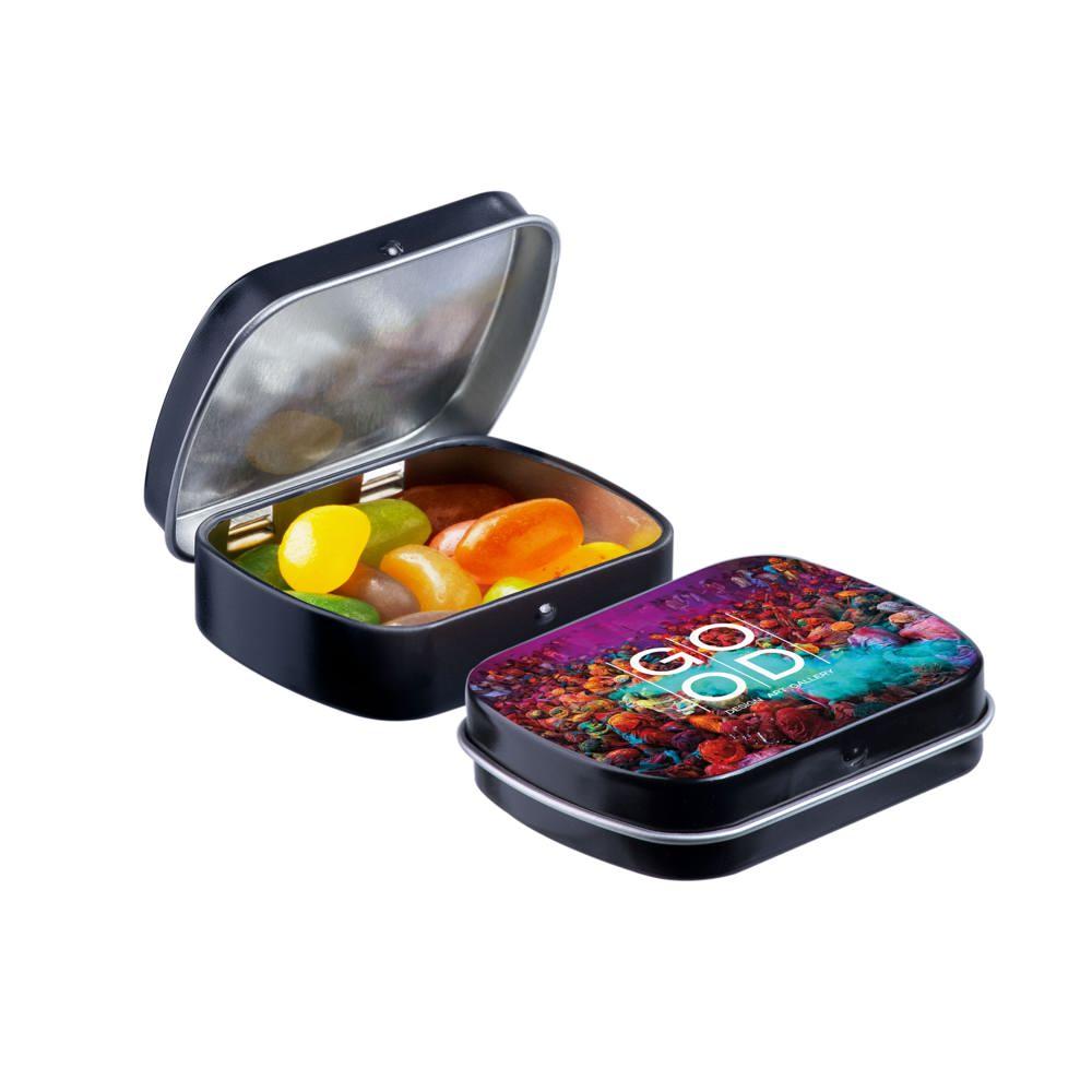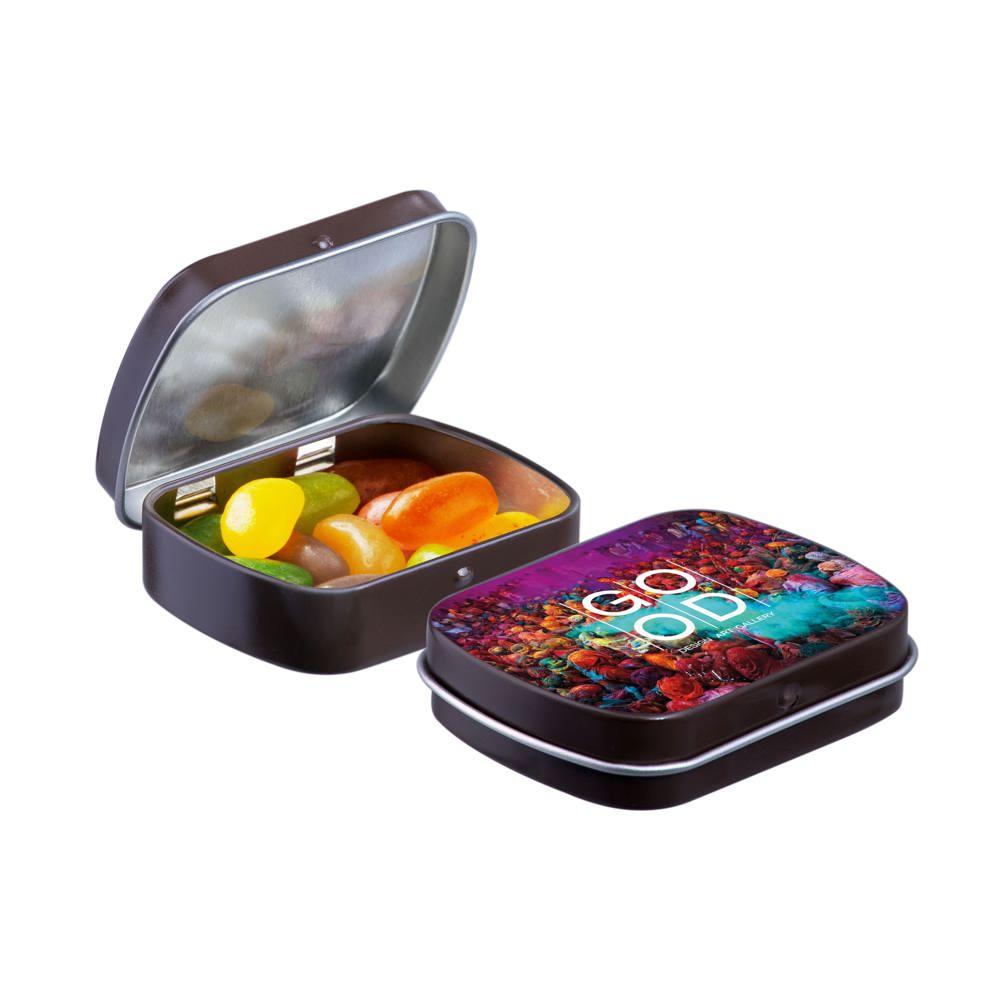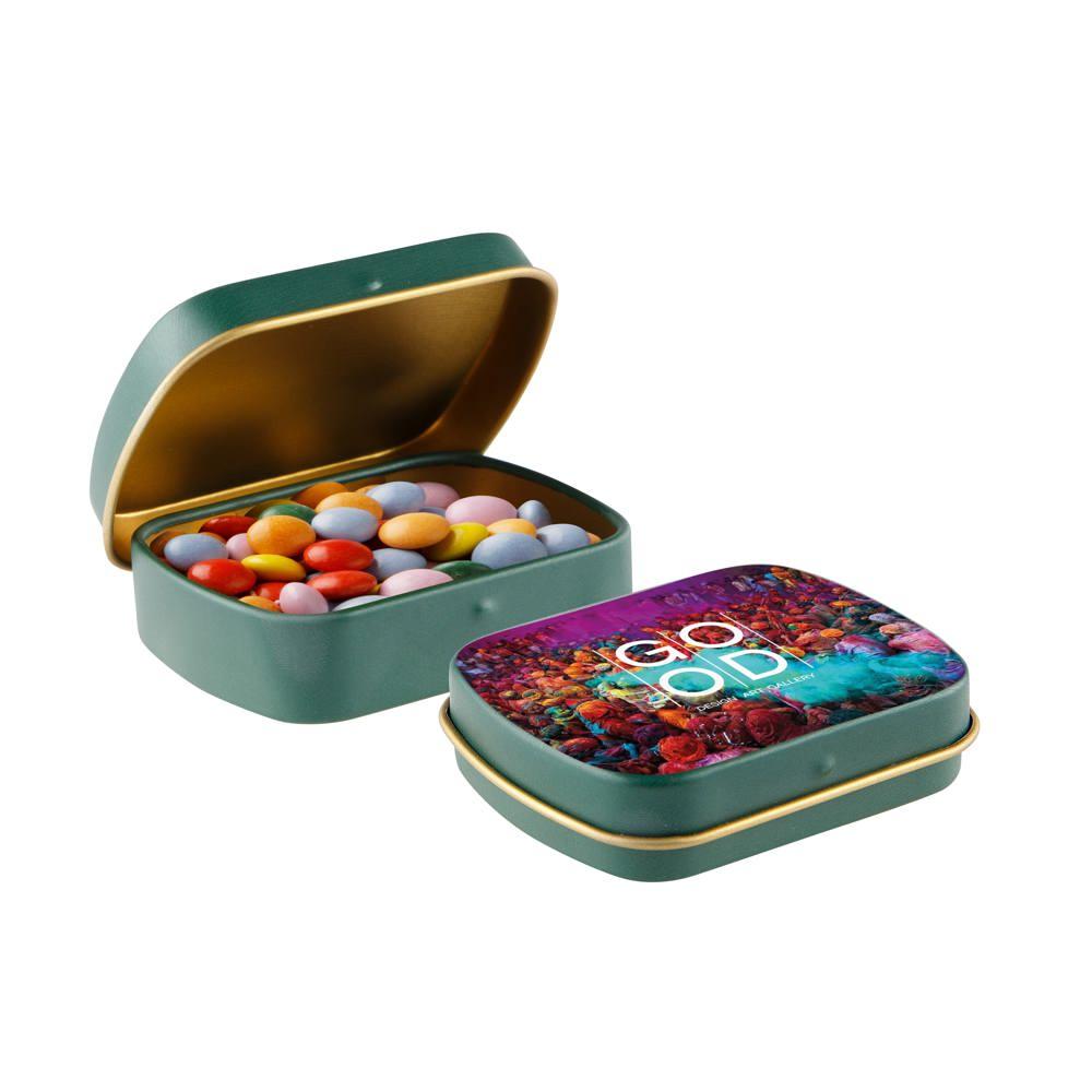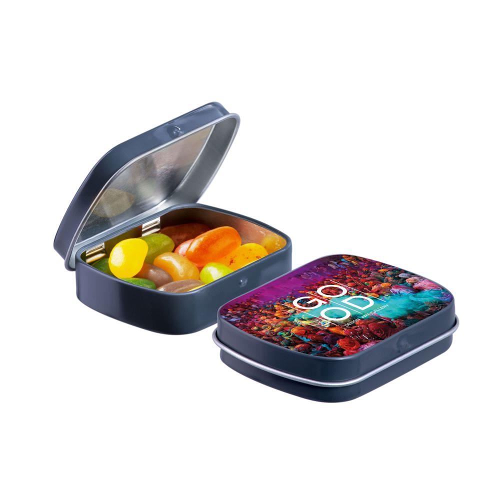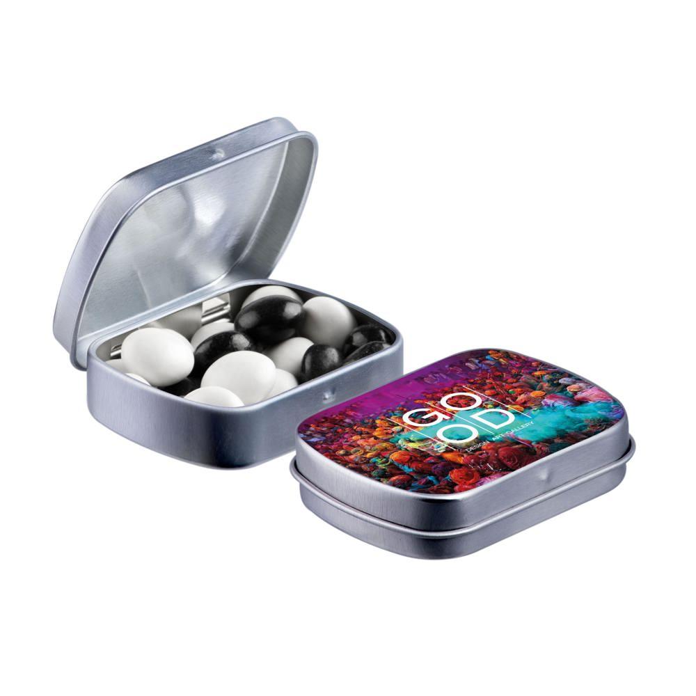 Elevate your brand with our Mini Hinge Tin with Candy, packed with approximately 23 grams of irresistible Mini Choco's. Personalize it with your full-color logo print for eye-catching promotion that delights recipients and boosts visibility.