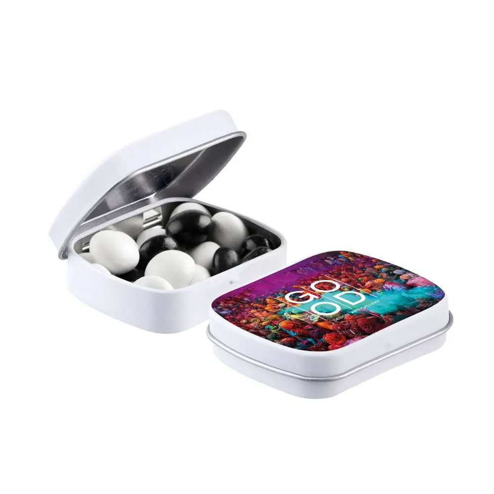 Elevate your branding with this mini hinge tin, featuring around 23 grams of delightful mini chocolates. Customize it with full-color printing to showcase your logo, making it an ideal giveaway for marketing campaigns and corporate events.