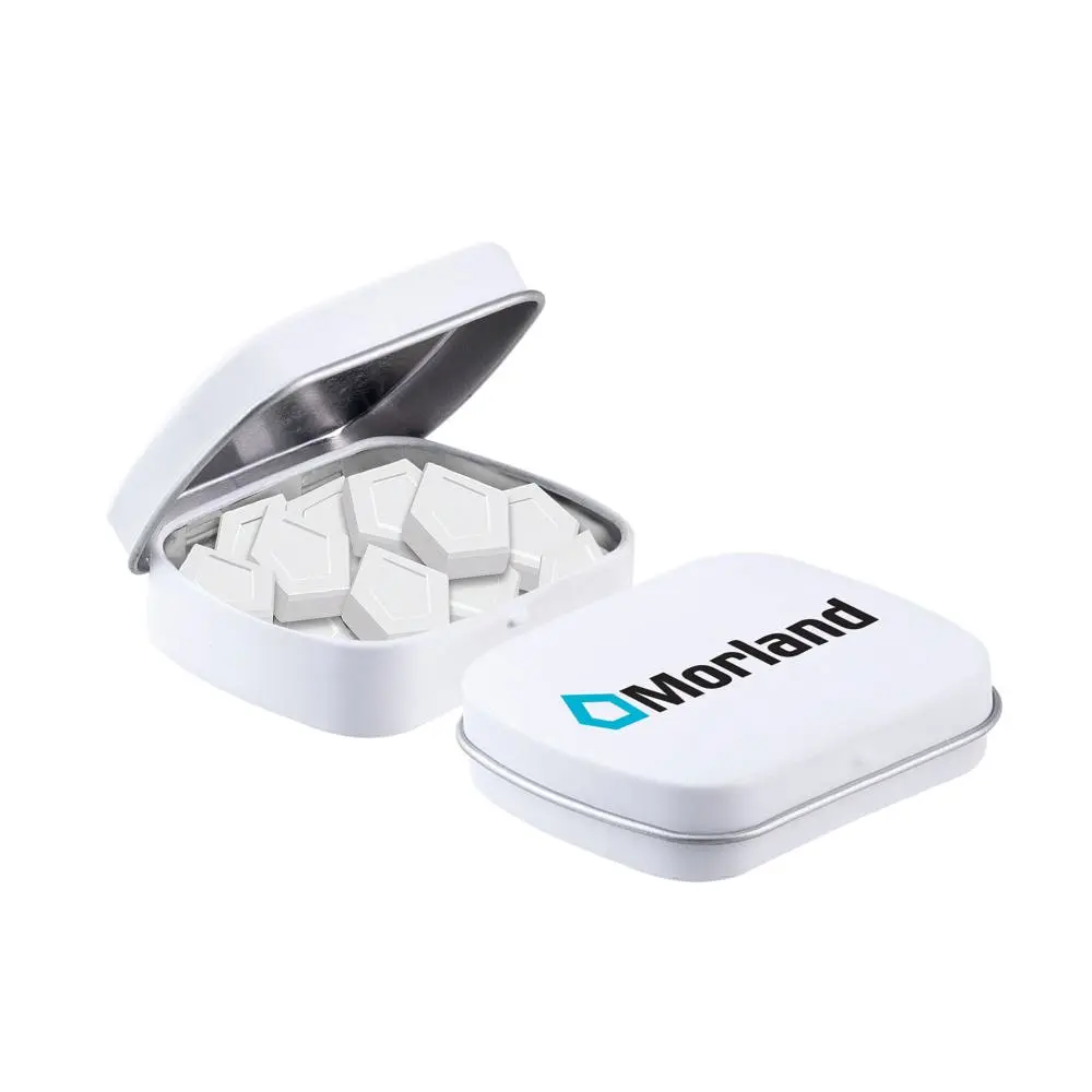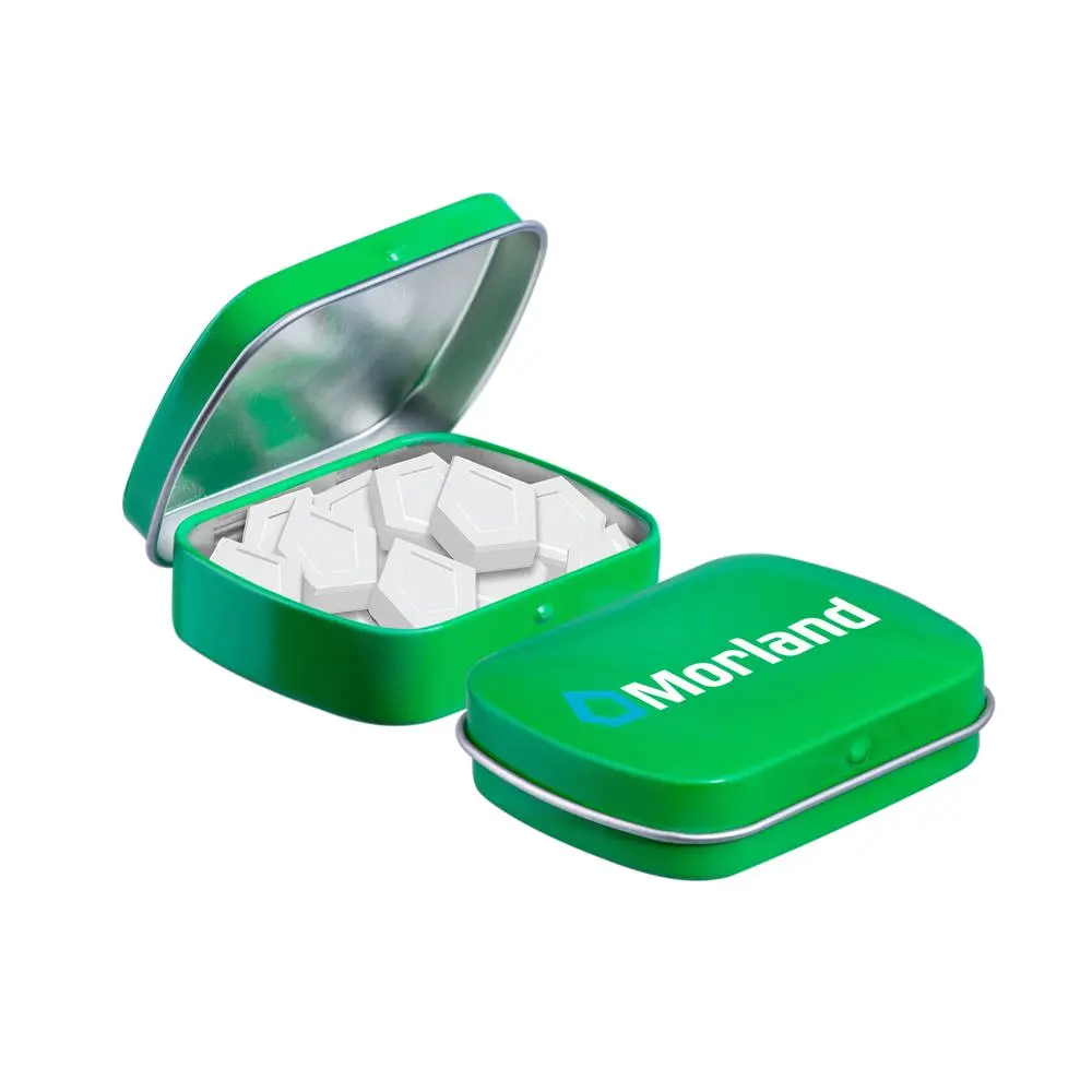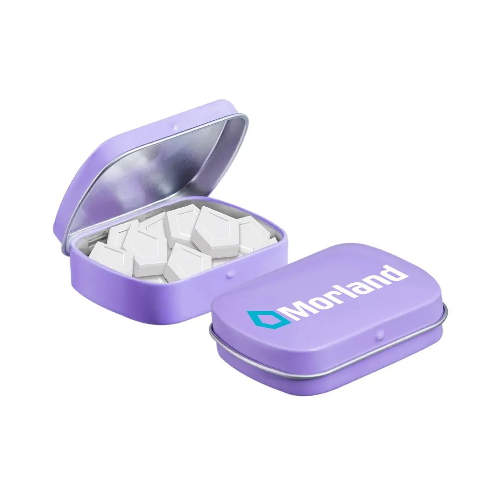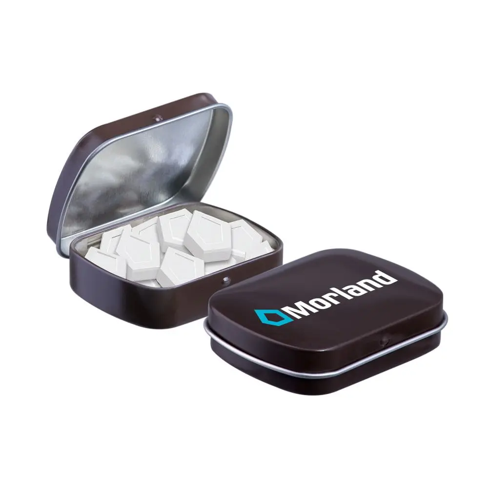 Elevate your brand's visibility with our mini hinged tin filled with approximately 23 grams of personalized logo mints. Ideal for marketing professionals and event organizers, these compact tins serve as memorable giveaways that keep your logo front and center long after the event.