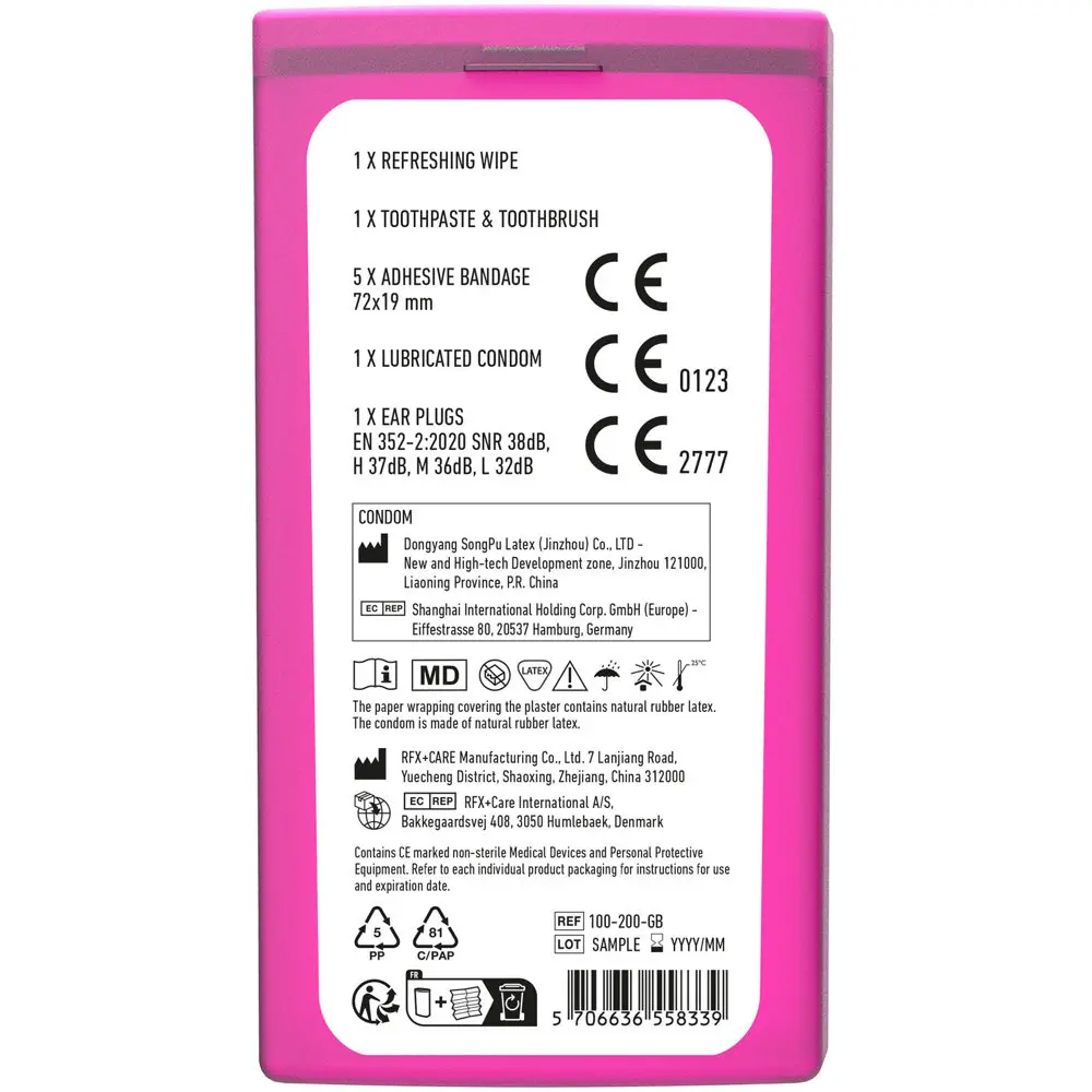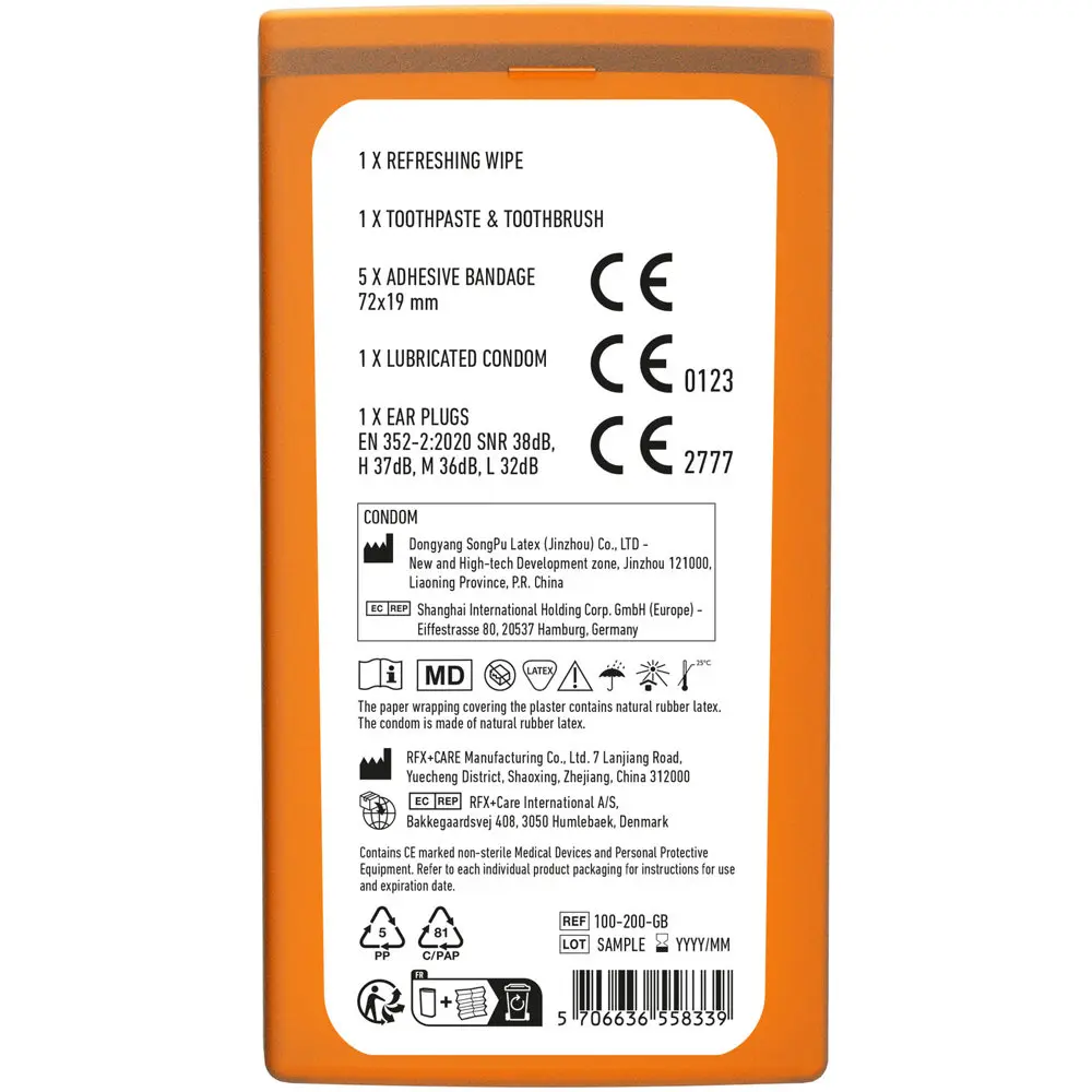 Packed with practical essentials—toothbrush, toothpaste, earplugs, antibacterial gel, five wash-proof plasters, and a condom—this kit ensures festival-goers stay comfortable and prepared. All items comply with EU regulations for safety and quality.
