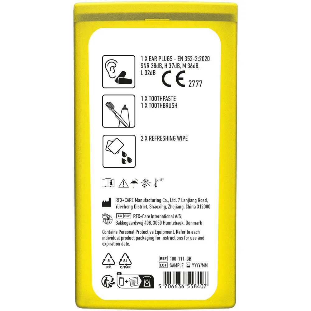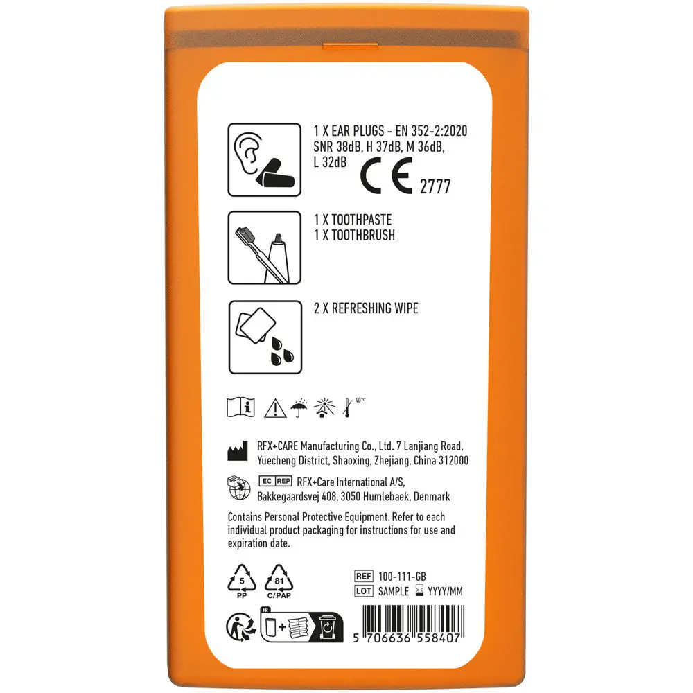 This pocket-sized kit measures just 4.9 x 9.7 x 2.5 cm, making it effortlessly portable for travelers. Crafted from durable plastic and produced in Europe for sustainability, it includes essentials like a toothbrush, toothpaste, earplugs, and two refreshing wipes. All items comply with EU regulations, ensuring quality and safety for recipients.