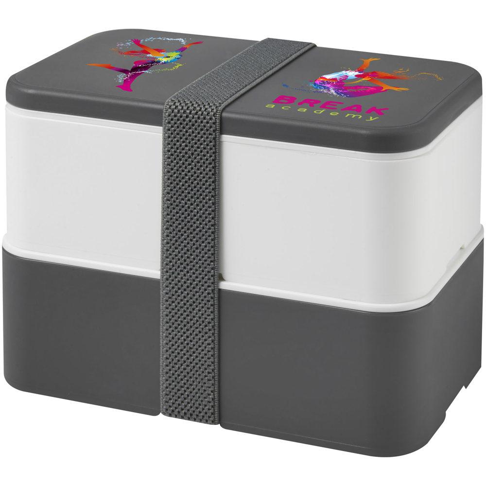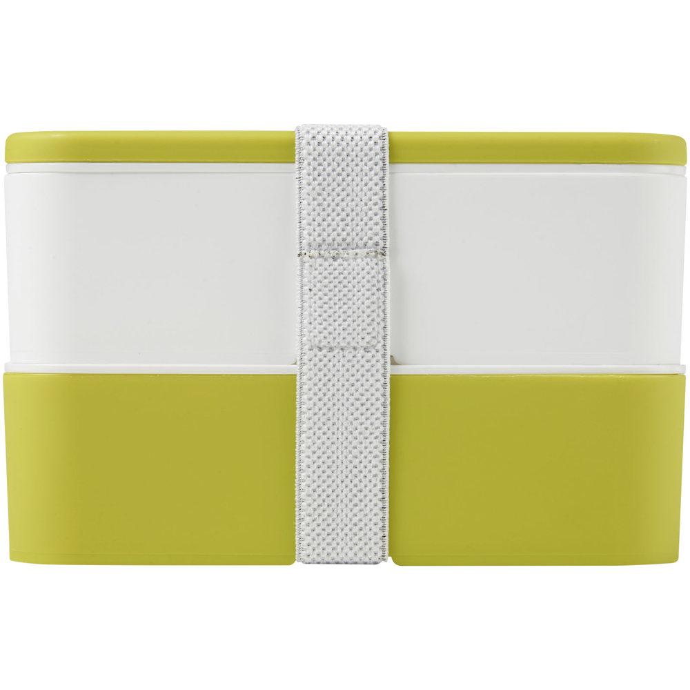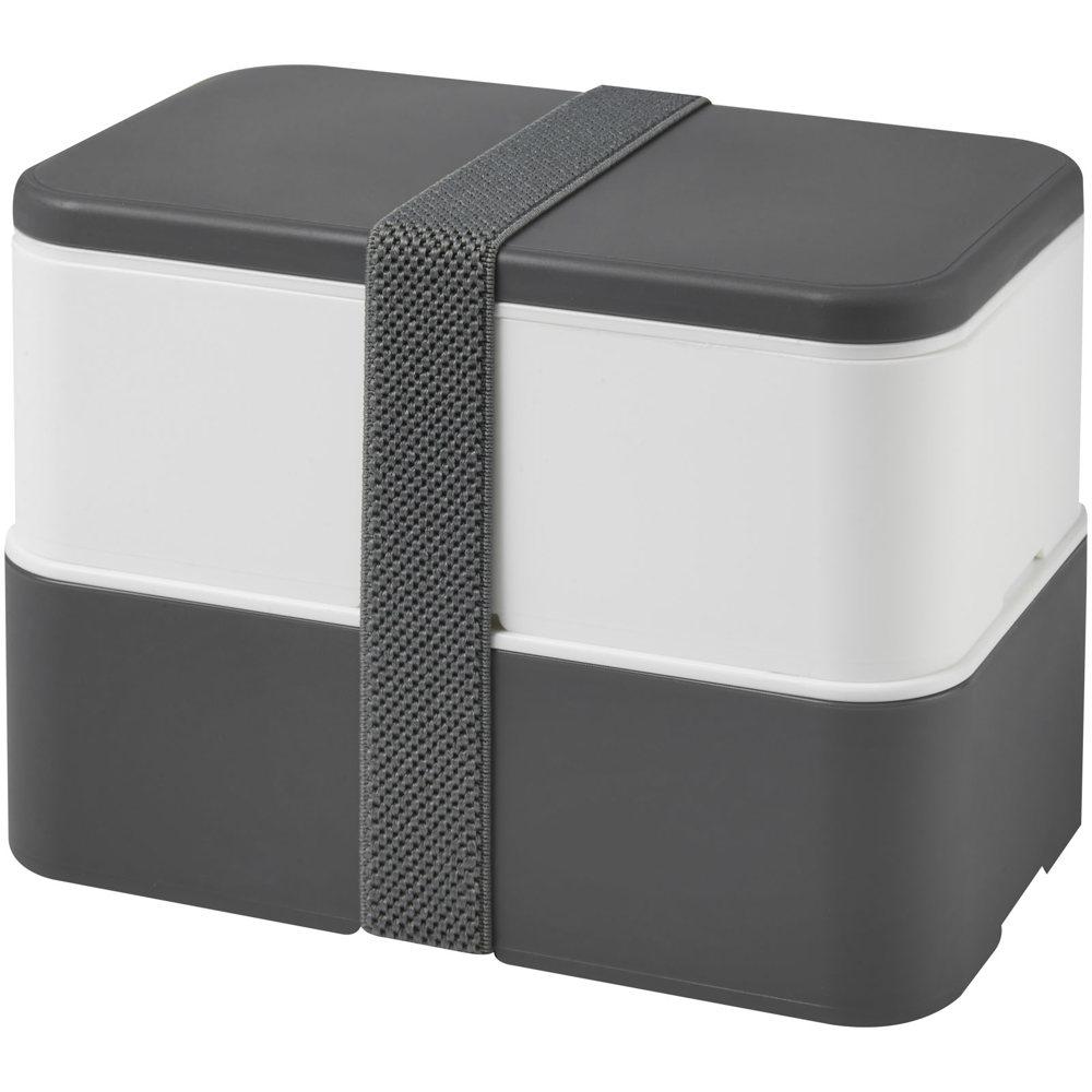 Elevate your promotional gifting with the MIYO 700+700 ml double layer lunch box, perfect for marketing campaigns and events. Its spacious dual 700 ml compartments keep meals separated—ideal for sandwiches, salads, fruits, and more—secured by a durable band made from recycled PET for hassle-free transport.
