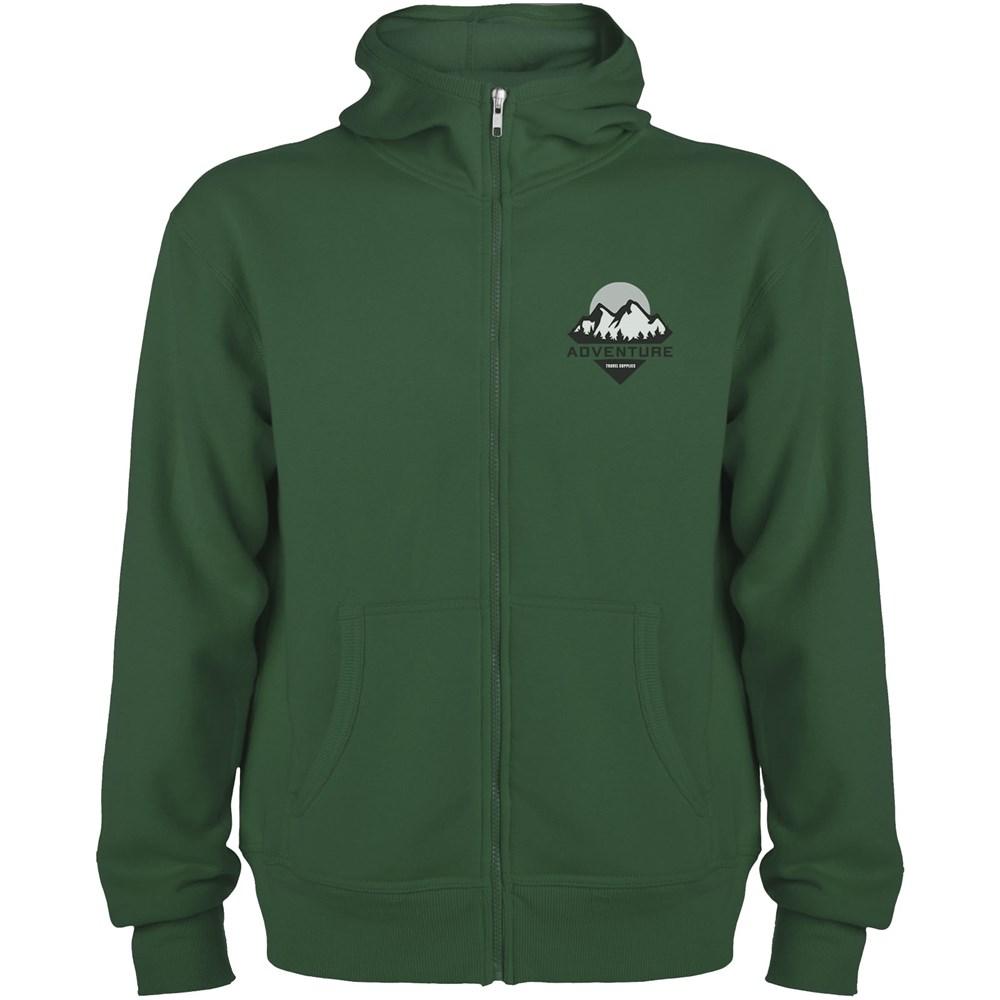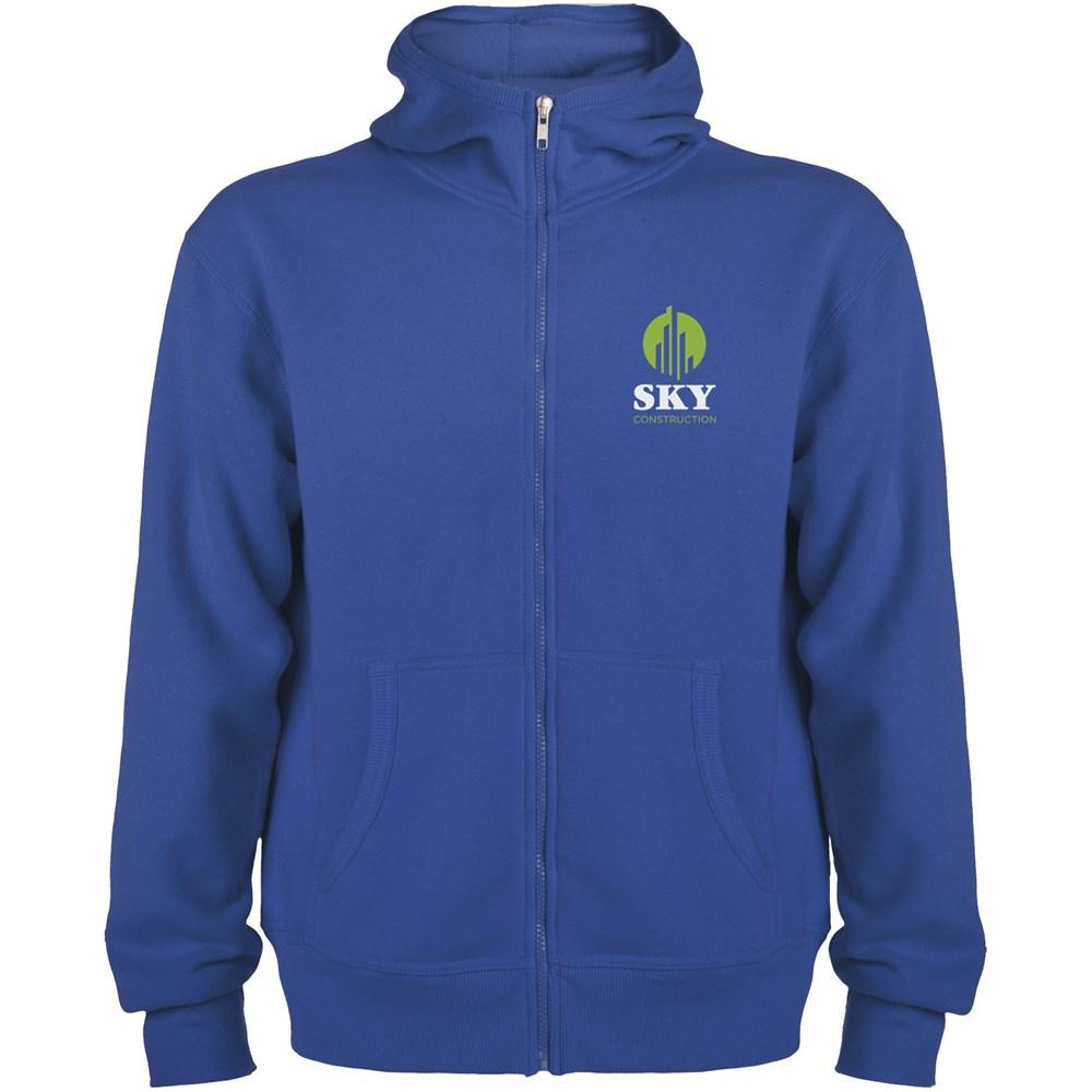 This premium sweat hoodie features a high neck for added warmth, smooth full zip for effortless layering, ribbed details in the hood and pocket piping for a polished look, a spacious kangaroo-style pocket for convenience, and 2x2 ribbed cuffs and waist for a secure, flattering fit. The removable label ensures seamless personalization, making it ideal for your company branding.
