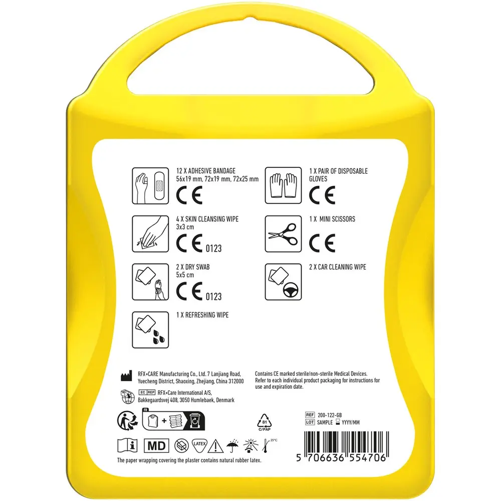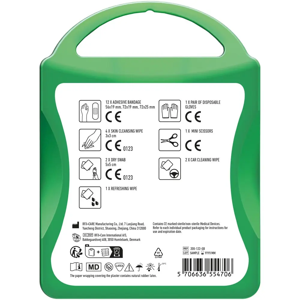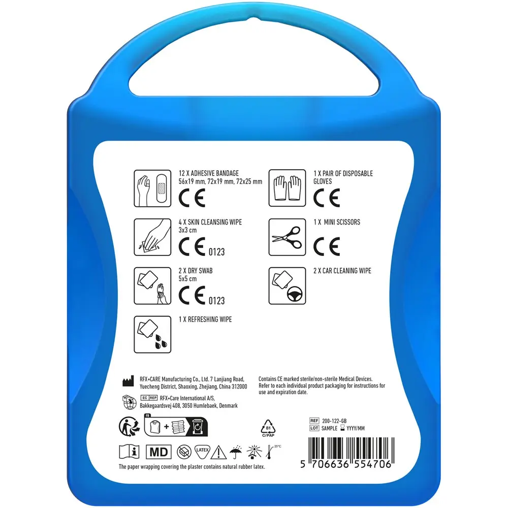This kit includes 12 waterproof plasters, 2 skin cleansing swabs, 2 dry swabs, 1 pair of disposable gloves, 1 car cleaning pack (2 pieces), 1 refreshing wipe, and 1 mini scissor. All items comply with EU safety standards, providing reliable care for minor cuts, scrapes, and spills.