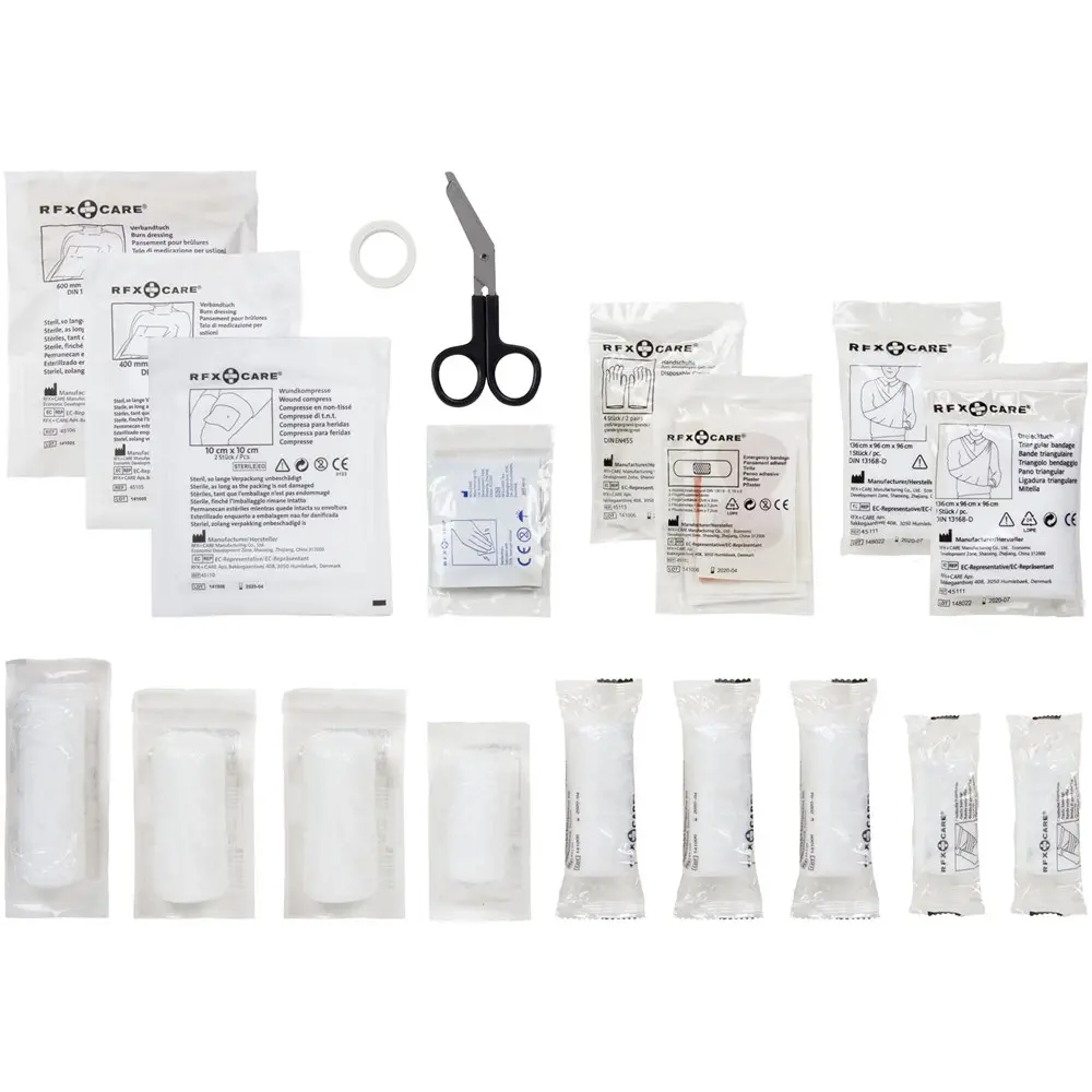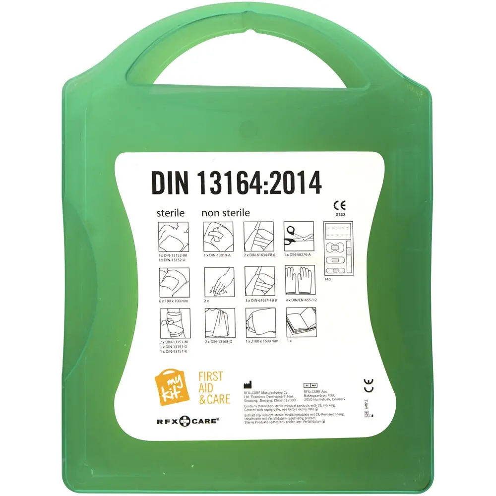 Elevate your brand's safety commitment with the MyKit DIN first aid kit, a DIN-approved essential for every vehicle. This compact, plastic kit (27 x 19.7 x 7.6 cm) is fully stocked with vital supplies including dressings, bandages, scissors, gloves, triangular bandages, a first aid blanket, and more—all meeting strict EU regulations for reliable emergency care.