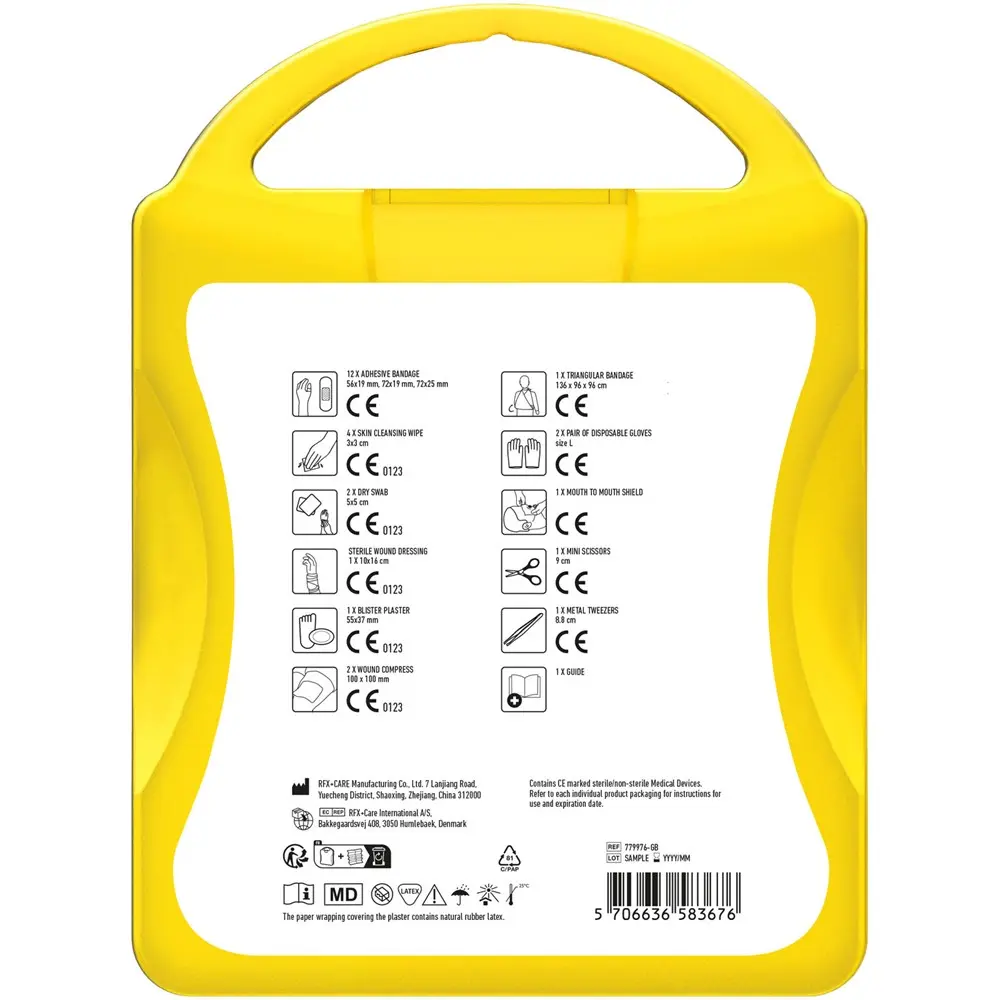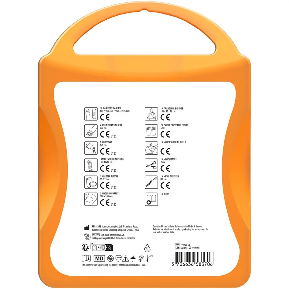 Packed with essentials: a first aid guide, blister plasters, 12 washproof plasters, metal tweezers, scissors, triangular bandage, disposable gloves, two wound compresses, sterile wound dressing, two dry swabs, four skin cleansing swabs, and a mouth-to-mouth shield—all compliant with EU regulations. Made in Europe for sustainability, it's perfect for personalization to showcase your logo and reinforce your commitment to well-being.