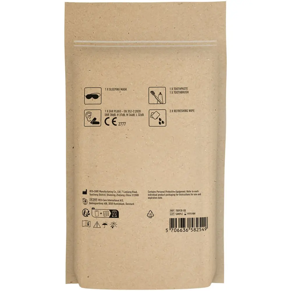 This versatile kit includes one eye mask for blocking light, two ear plugs for noise reduction, and two refreshing wipes for quick clean-ups. Packaged in a sustainable FSC-certified paper pouch, it measures 12 x 20.9 x 2.8 cm and arrives in an individual gift box. All contents comply with EU regulations for safety and quality. Proudly made in Europe to support eco-friendly practices.