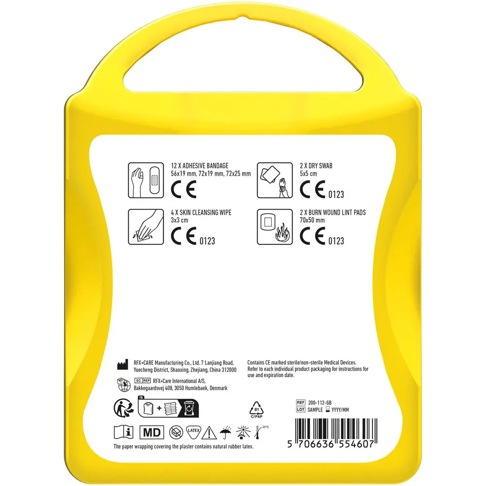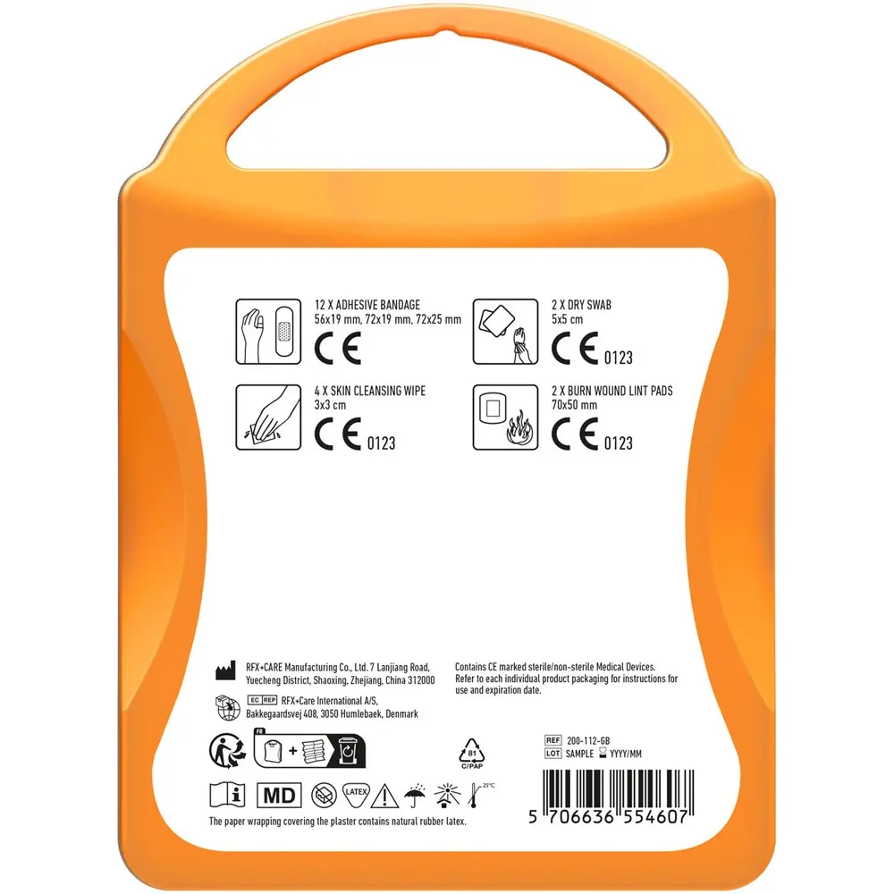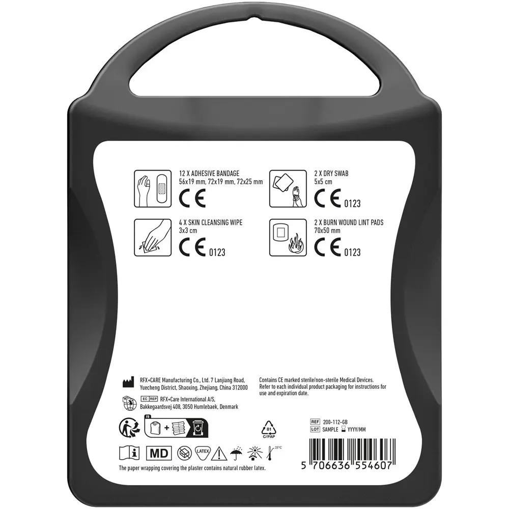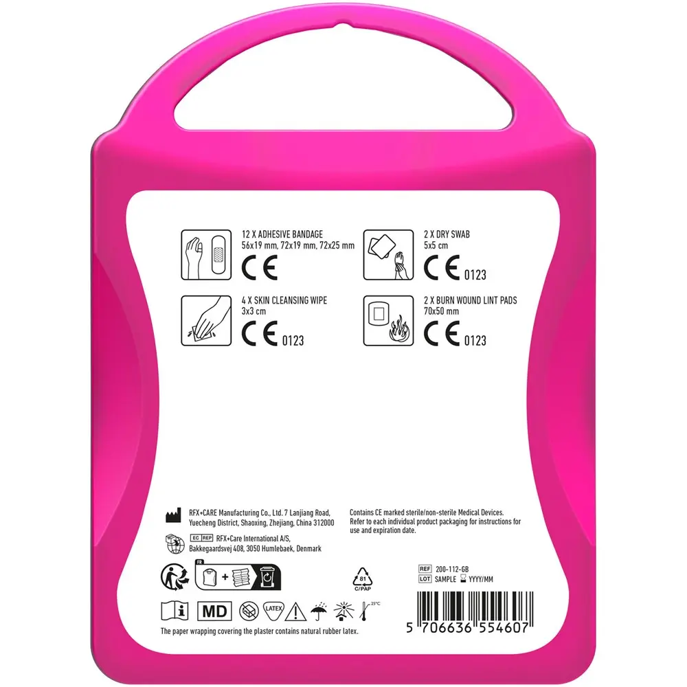 Packed with high-quality essentials—12 waterproof plasters, 4 skin cleansing swabs, 2 dry swabs, and 2 burn wound lint pads—the contents meet all EU regulations for reliable care. Ideal for branding with your logo, it boosts visibility while promoting well-being, fostering positive brand associations among clients and attendees.