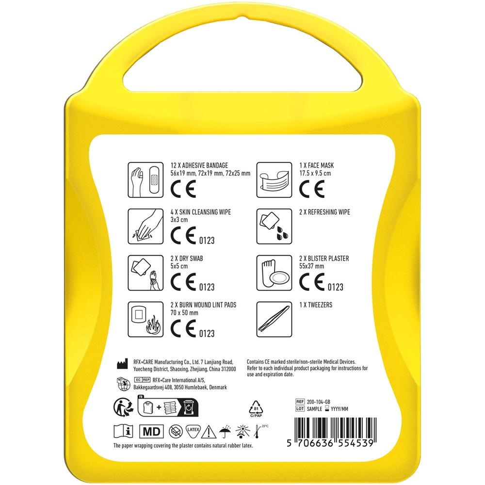 Packed with essentials meeting all EU regulations: 12 wash-proof plasters, 4 skin cleansing swabs, 2 dry swabs, 1 mask, 2 blister plasters, 2 burn wound lint pads, 2 refreshing wipes, and 1 tweezer. Its portable design fits seamlessly in offices, event spaces, or goody bags.