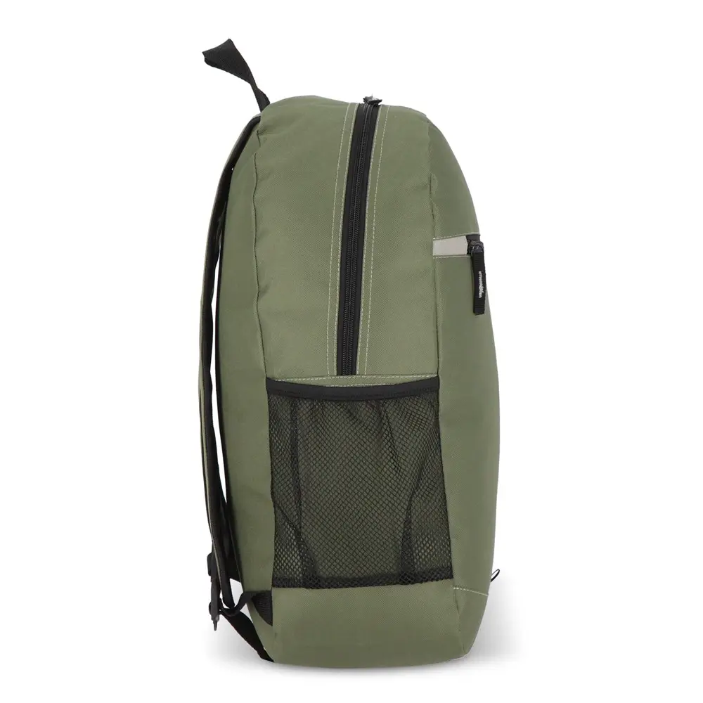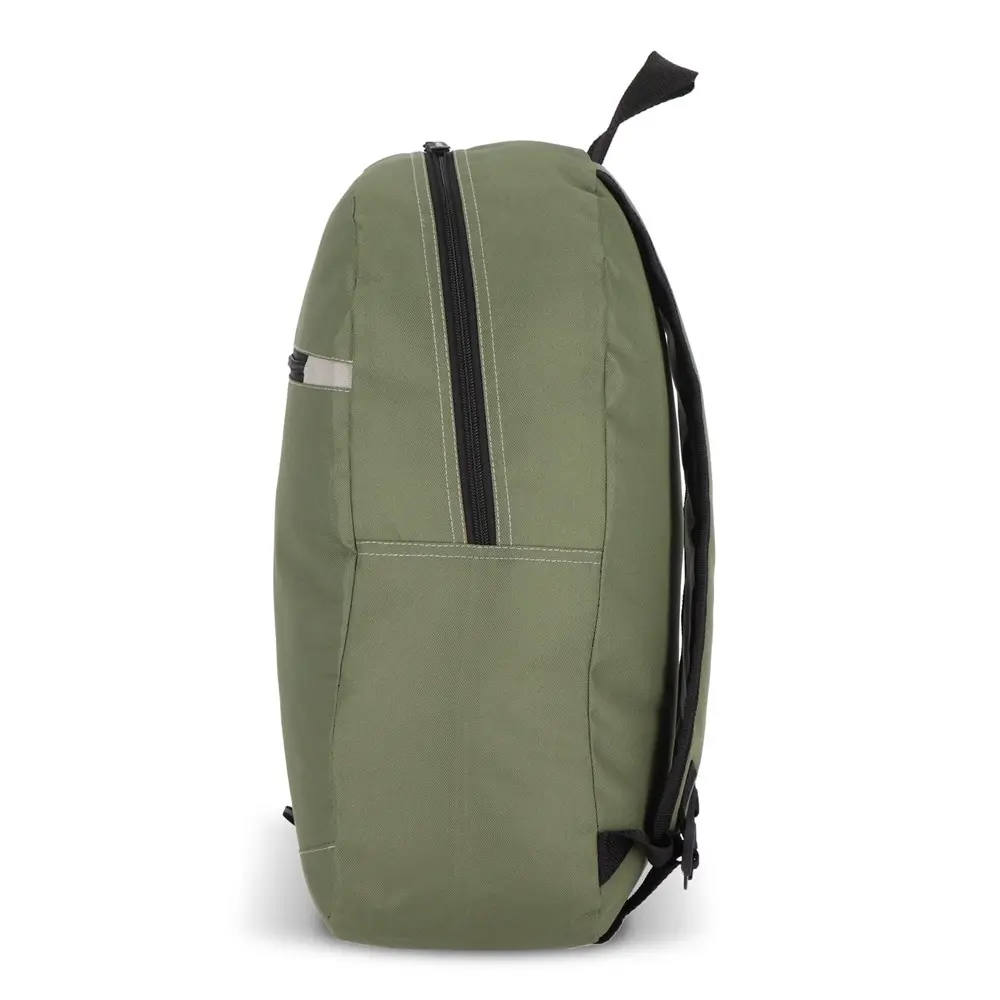 This backpack is made of recycled PET. It features adjustable padded shoulder straps, a top grab handle, a front zippered compartment, a side mesh pocket and a small reflective strip for visibility at night.