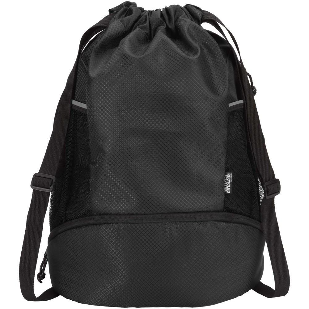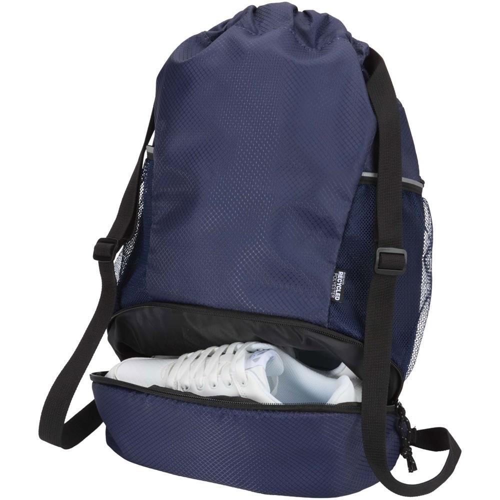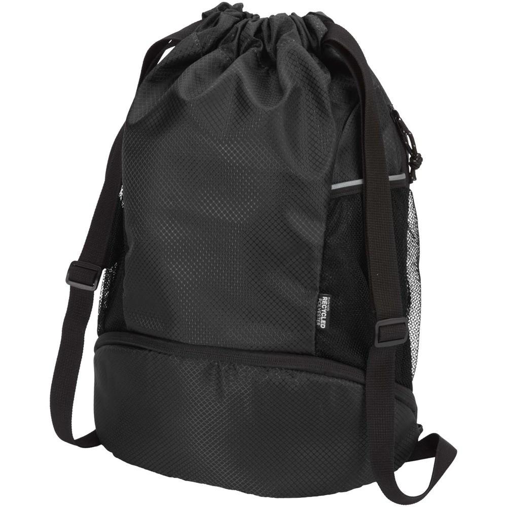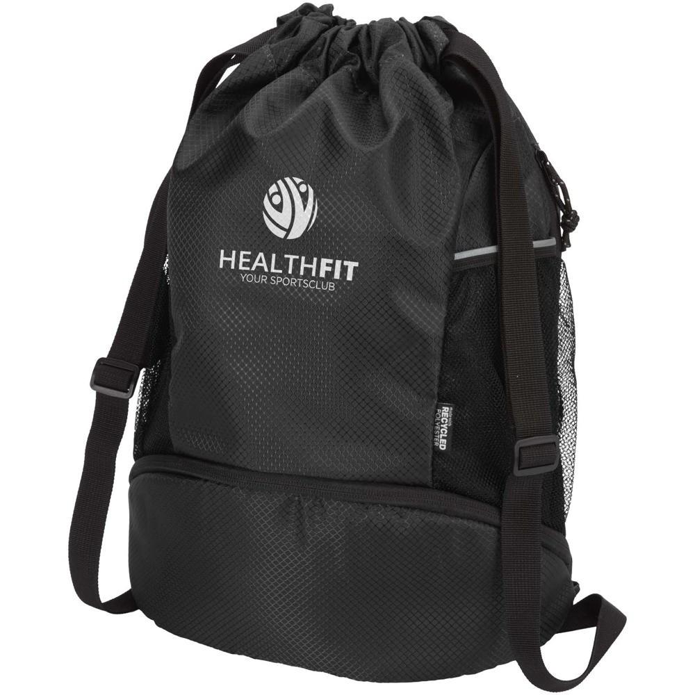 Elevate your brand with the Nomad GRS recycled sports drawstring bag featuring a dedicated bottom compartment and 18L capacity. Crafted from GRS certified recycled ripstop fabric with a water-repellent finish and GRS certified RPET lining, this eco-friendly gym bag showcases your commitment to sustainability while delivering premium functionality for promotional giveaways.
