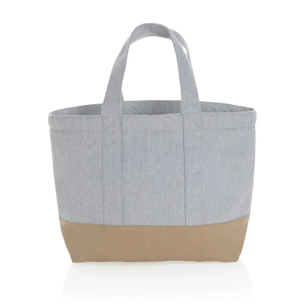 Elevate your brand's eco-conscious promotions with the Nopa Tote Cooler Bag, crafted from 285 g/m² Impact Aware™ recycled canvas. This versatile 13L bag keeps beverages and snacks chilled during events, picnics, or client outings, fitting up to 8 cans while folding flat for easy storage and transport. Ideal for marketing teams and event organizers seeking sustainable giveaways, it features the AWARE™ tracer for verified recycled content—70% recycled cotton and 30% recycled polyester—undyed to minimize environmental impact without bleaching chemicals. PVC-free and compliant with AZO dye and formaldehyde directives, it's a perfect canvas for custom logo printing to boost visibility. Plus, 2% of proceeds support Water.org, aligning your promotions with global sustainability goals and appealing to eco-aware recipients.
