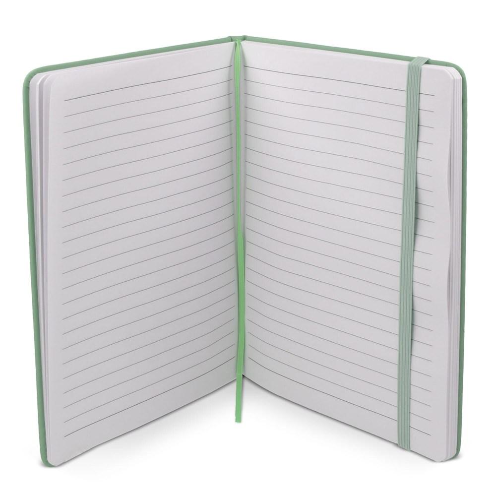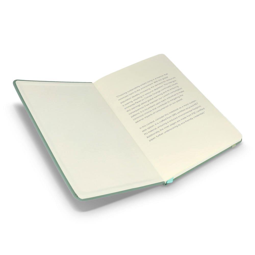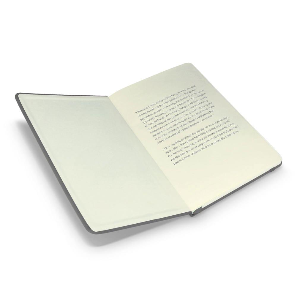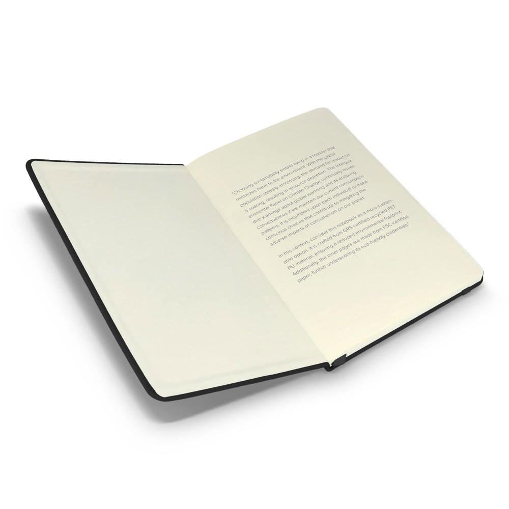 Elevate your brand with our eco-friendly A5 notebook, perfect for marketing campaigns, events, and client giveaways. Made from durable recycled R-PET/PU cover material with a professional finish, it combines sustainability with style. The interior features high-quality, lined FSC-certified pages for smooth writing and long-lasting notes—ideal for professionals capturing ideas on the go.