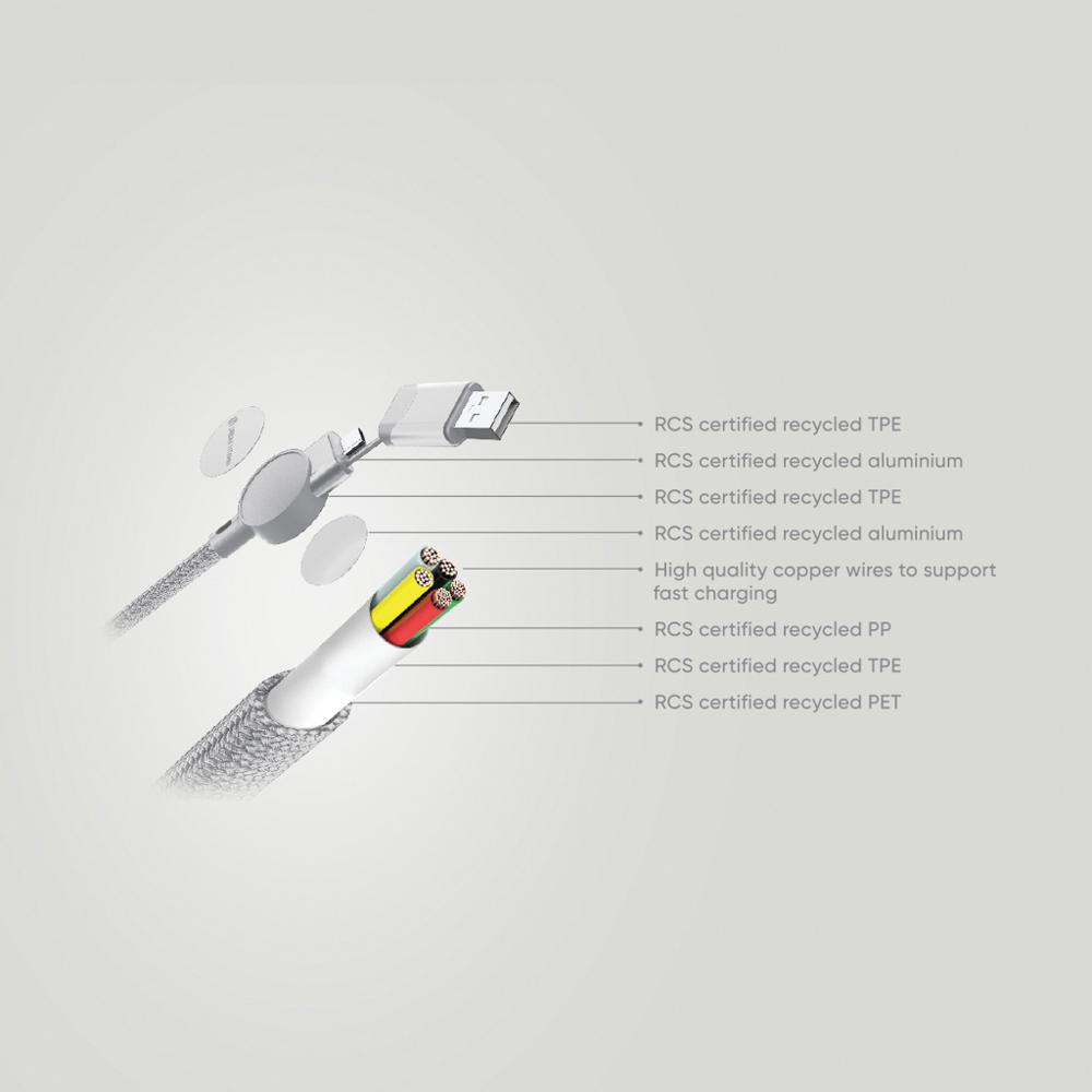 - Eco-friendly design: Crafted from 100% RCS-certified recycled TPE plastic (case) and recycled TPE inner/ PET outer materials (cable). RCS verifies recycled content throughout the supply chain, appealing to environmentally conscious audiences.