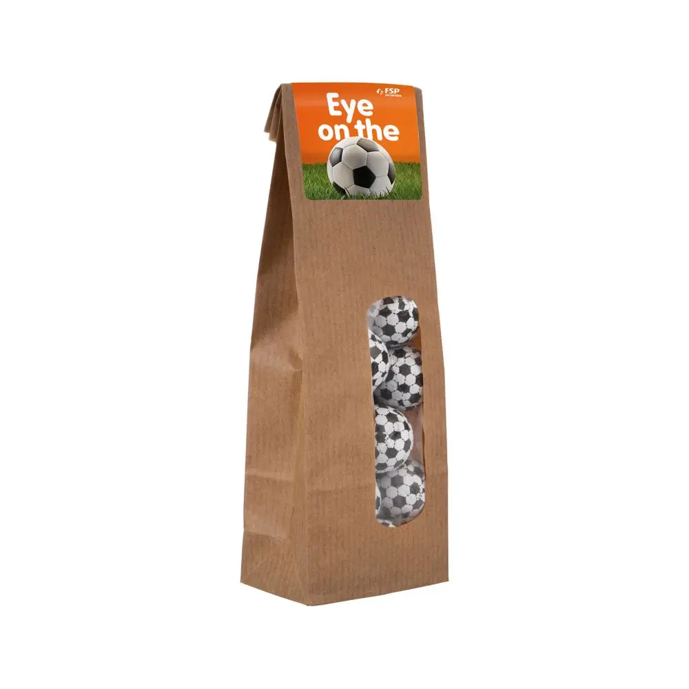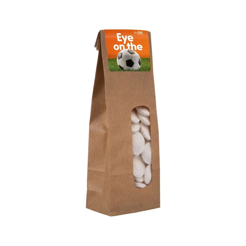 Elevate your brand's visibility with our customizable kraft paper bags featuring a convenient window and full-color sticker personalization. Each bag is thoughtfully filled with approximately 125 grams of assorted licorice sticks, offering a delightful treat that delights recipients at events, trade shows, or as promotional giveaways.