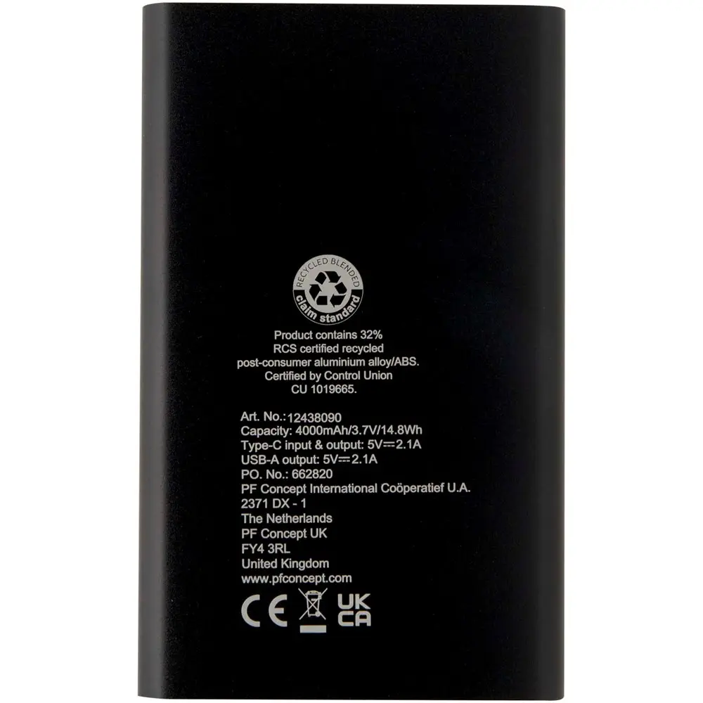 Crafted from 25% RCS certified recycled aluminium, this power bank supports your company's sustainability goals while offering a premium feel. The 4000 mAh lithium polymer battery provides reliable output up to 10W, making it ideal for promotional giveaways that highlight environmental responsibility.
