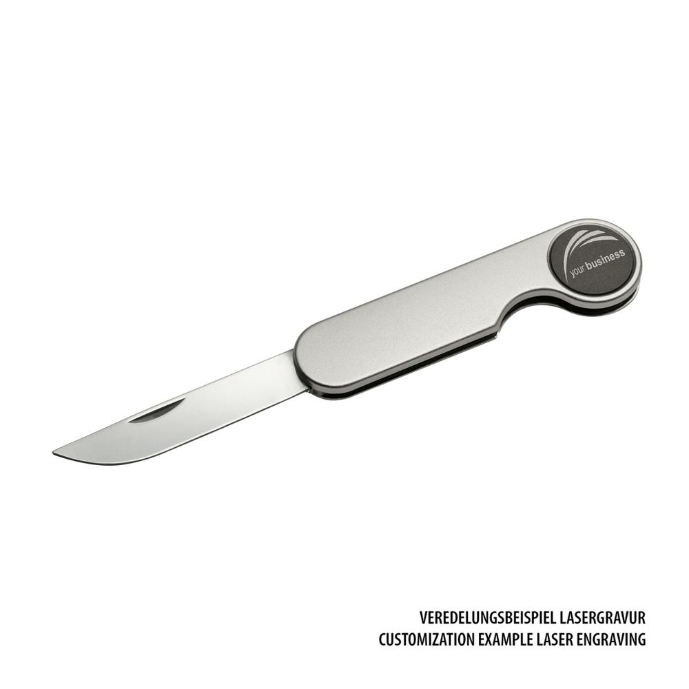 Elevate your promotional giveaways with this premium pocket knife, crafted from high-quality aluminum and stainless steel. Its sharp stainless steel blade locks securely into the robust body, ensuring safety and reliability for everyday use or outdoor adventures.