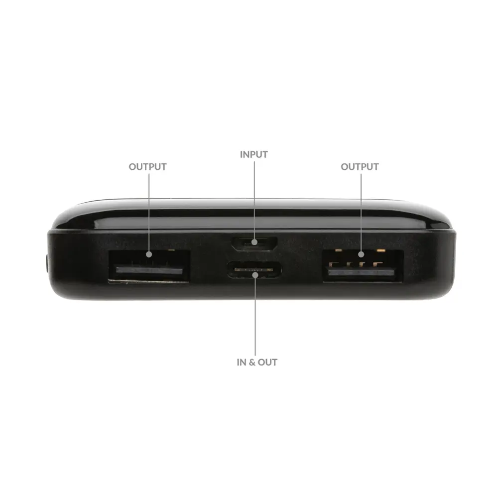 Ideal for marketing professionals and event organizers, this compact, pocket-sized design includes a high-density lithium polymer battery, LED power indicators, and versatile inputs/outputs: Micro USB (5V/2A), Type-C (5V/2.4A input/2A output), and USB (5V/2.4A output). PVC-free construction and a recycled TPE charging cable ensure environmental responsibility.