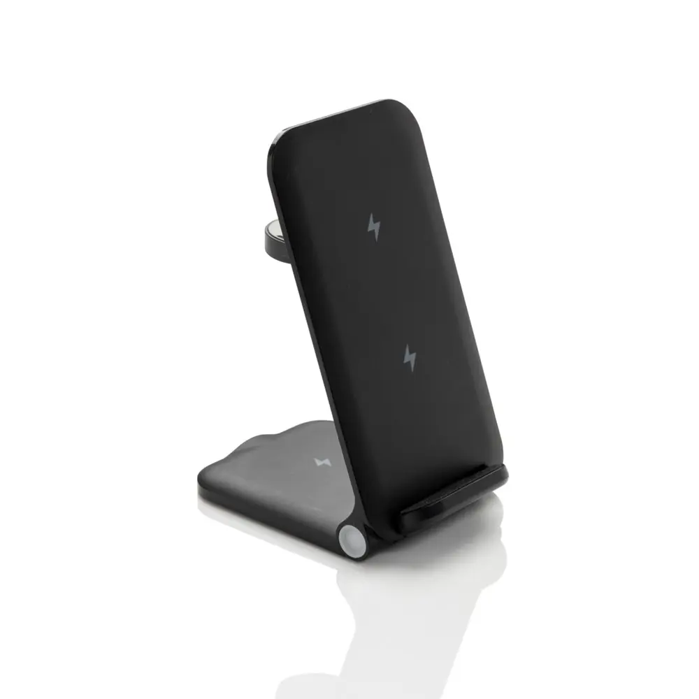 This versatile foldable stand charges three devices simultaneously: a fast 15W pad for smartphones, a 5W spot for earbuds cases, and a 2.5W module for Apple Watches—perfect for keeping clients powered up at events or trade shows. Its compact design travels easily, and the included 120cm recycled TPE cable adds convenience without environmental compromise.