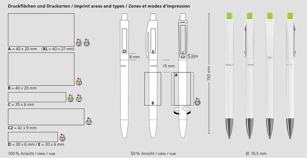 Crafted from recycled plastic, including rABS for the barrel and push button, plus rPOM for the mechanism. The tip features brass nickel plating for durability. Embrace sustainability without compromising quality, appealing to environmentally aware audiences.