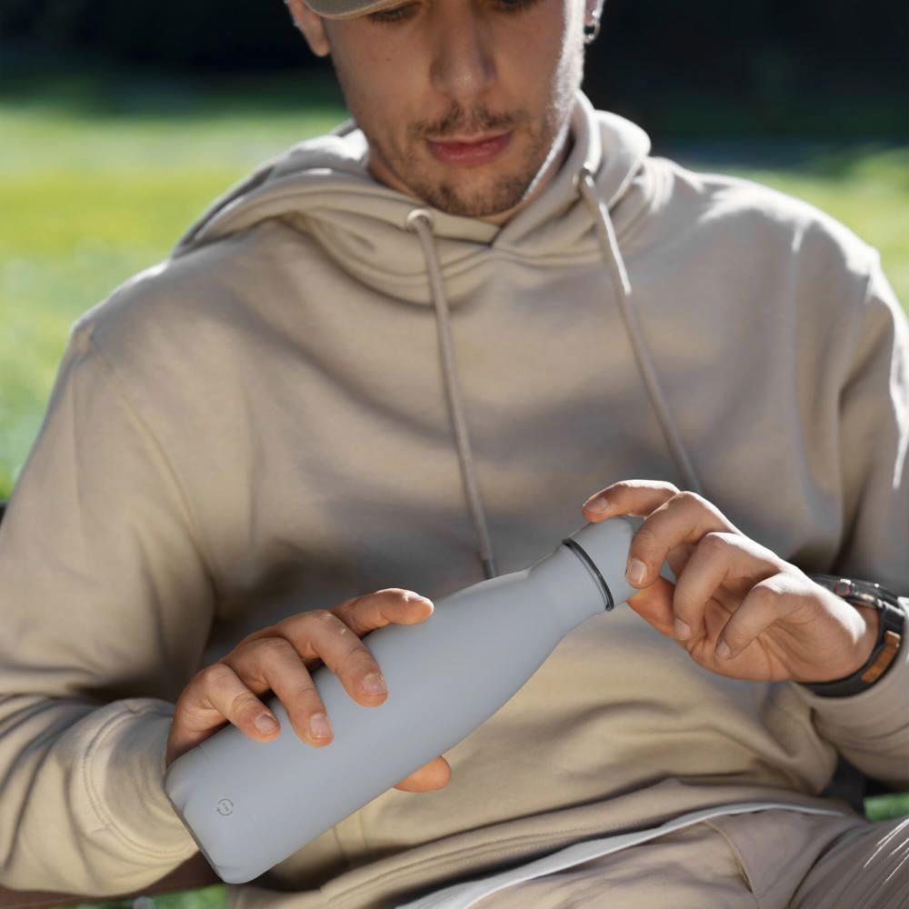 Elevate your brand visibility with the R-Swing Soft Touch 500ml bottle, made from recycled stainless steel for a sustainable promotional giveaway. Its buttery soft touch finish delivers a premium feel that recipients will love, while the double-walled vacuum insulation keeps beverages cold or hot for hours, ensuring practicality for daily use.