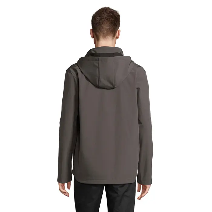Elevate your brand's visibility with this men's softshell hooded jacket, perfect for customizing with your logo. Designed for comfort and durability, it's an ideal giveaway for events, client appreciation, or team uniforms. The two-layer construction offers reliable protection against light wind and chill, while the polar fleece lining ensures warmth without bulk.