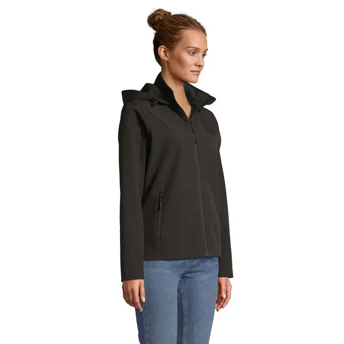 Elevate your brand's promotional efforts with this versatile women's hooded jacket, crafted from 100% recycled polyester for an eco-conscious choice. The softshell design offers reliable protection against light weather, while the polar fleece lining from recycled polyester ensures all-day warmth and comfort. Ideal for marketing campaigns, events, or client giveaways, this jacket combines functionality with a professional look.
