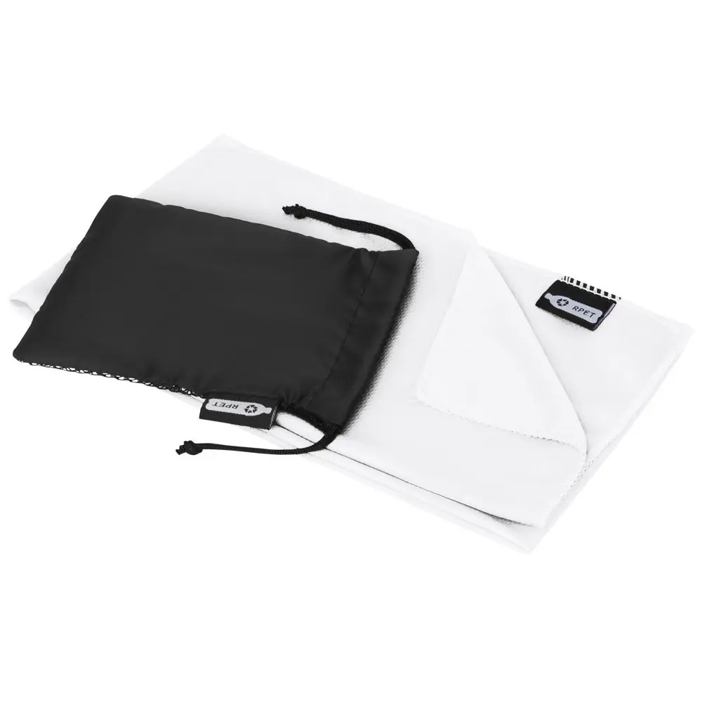 The included pouch, sized 15 x 11.5 cm and also made from recycled PET, features a secure closure for effortless portability. Carry it in a gym bag or distribute it as a branded accessory at trade shows. With a large print area on the pouch—and optional customization on the towel itself—this product allows for prominent logo placement, turning every use into a promotional opportunity.