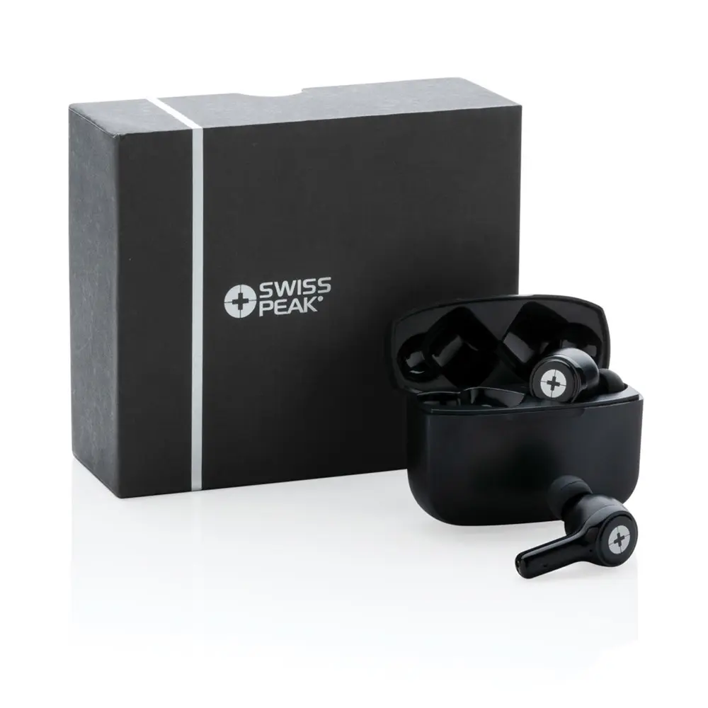 Elevate your brand's promotional game with the Swiss Peak ANC TWS earbuds, ideal for marketing professionals and event organizers seeking eco-friendly, customizable giveaways. These wireless earbuds deliver immersive stereo sound and active noise cancellation (up to 27 dB) to block distractions, ensuring recipients enjoy music or calls on the go—perfect for busy clients appreciating thoughtful, high-quality branding.