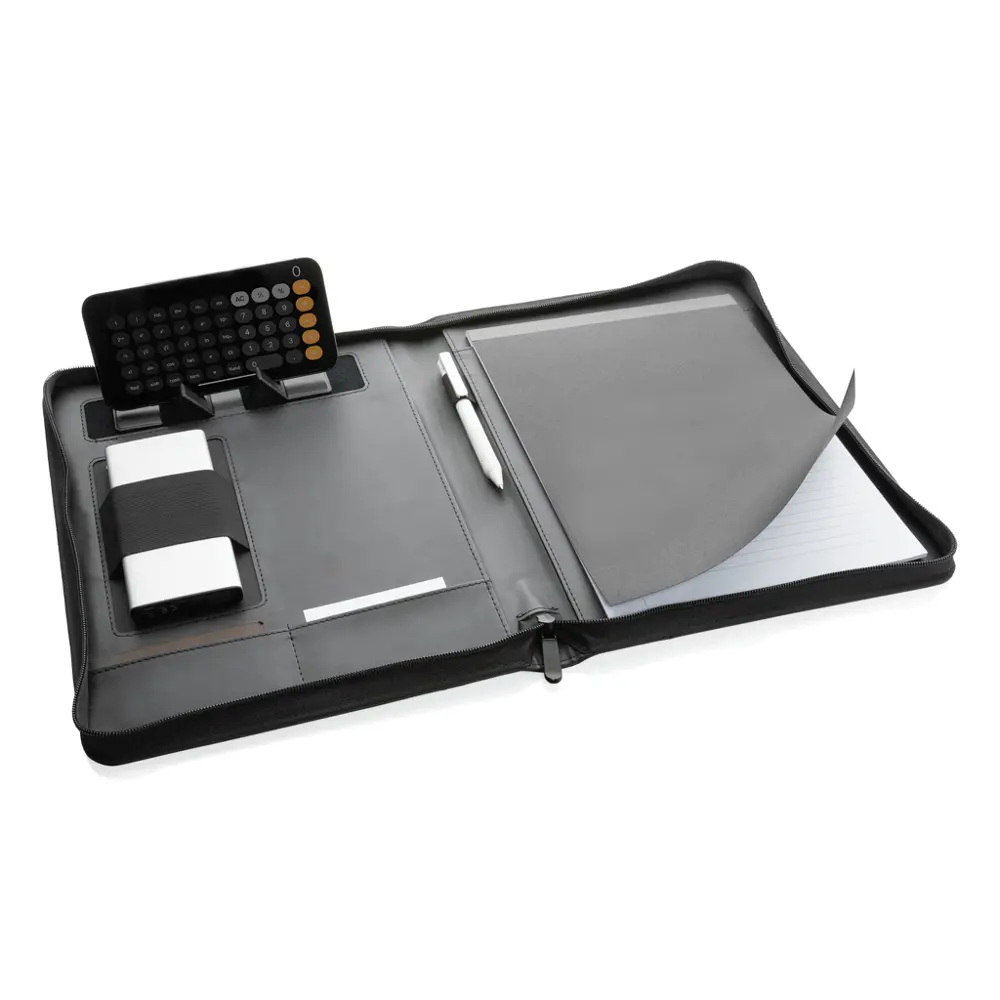 Designed for A4 documents, this zipped portfolio includes a 20-page lined notepad made from 64 g/m² recycled paper. Stay organized with dedicated slots: one phone-sized pocket, a secure phone holder, a pen loop, and two business card holders. These elements make it an ideal companion for meetings, events, or client interactions, combining functionality with a sleek, professional design.