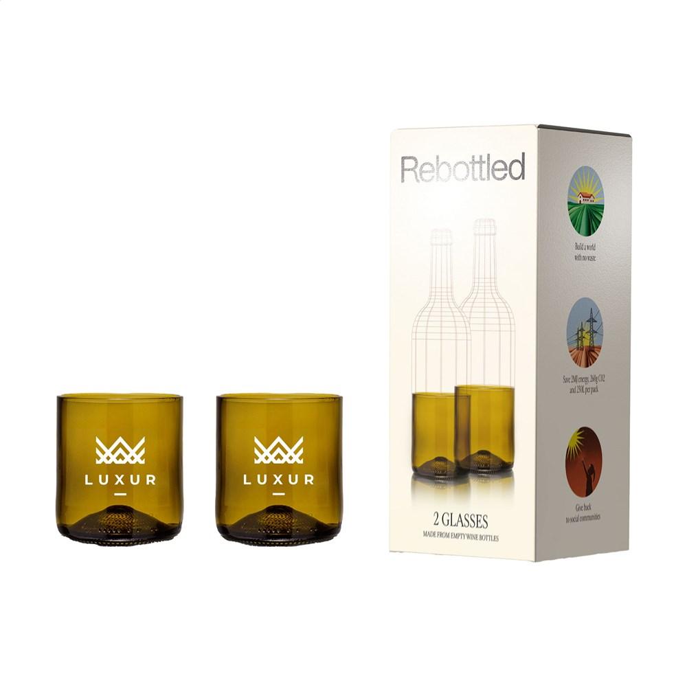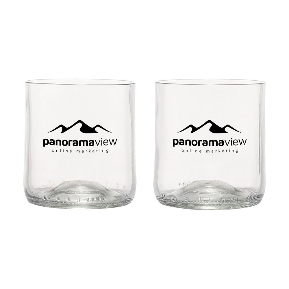 Elevate your brand with the Rebottled® Short Tumbler 2-pack, premium drinking glasses crafted from upcycled wine bottles. Each set features unique, recognizable designs that echo the original bottle shape, fitting comfortably in the hand with a smooth, high-quality finish—perfect for water, soft drinks, or wine.