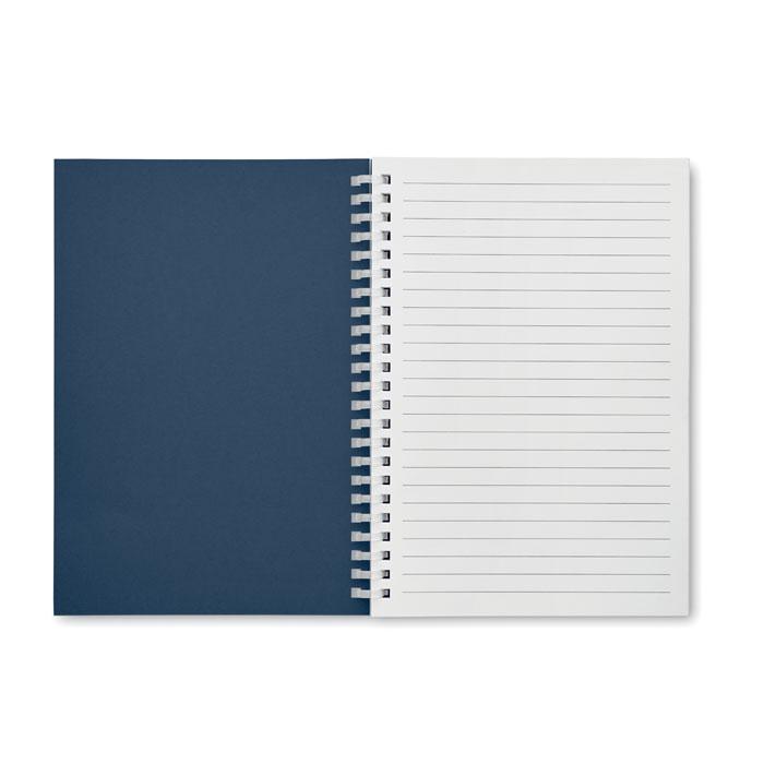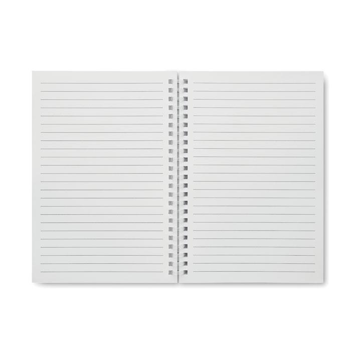 Elevate your brand with this sustainable A5 notebook featuring a recycled carton cover and soft ring binding for easy page turning. It contains 160 lined recycled paper pages (80 sheets), perfect for note-taking during meetings, events, or daily use.