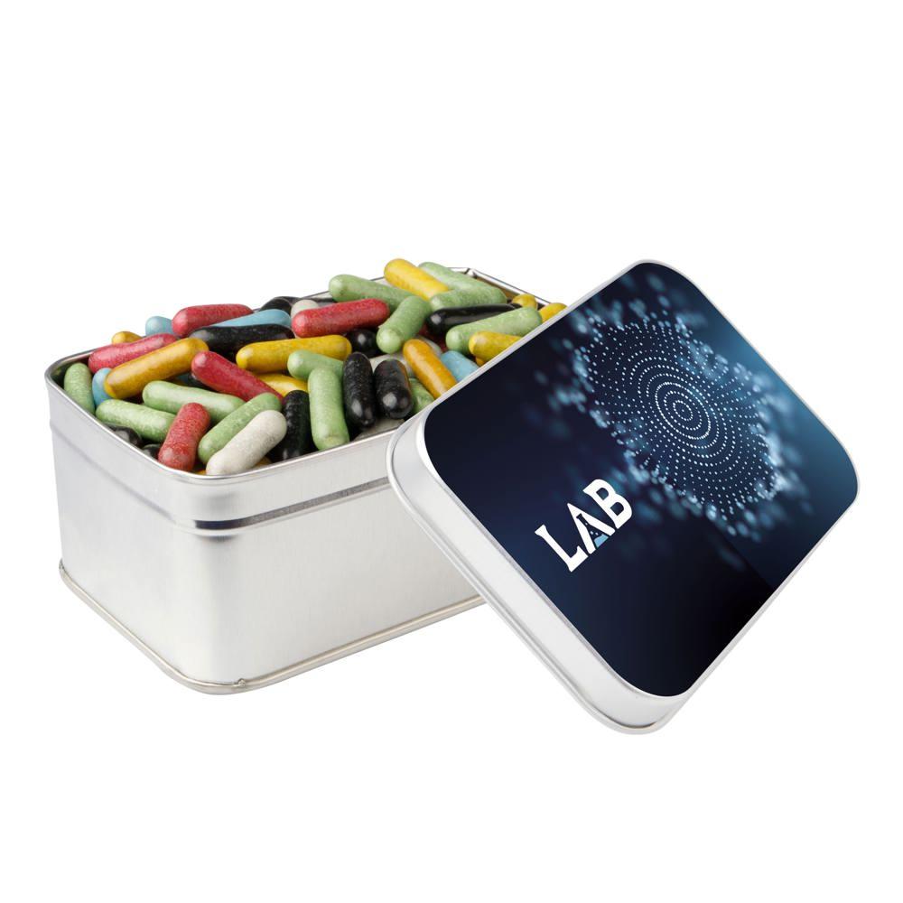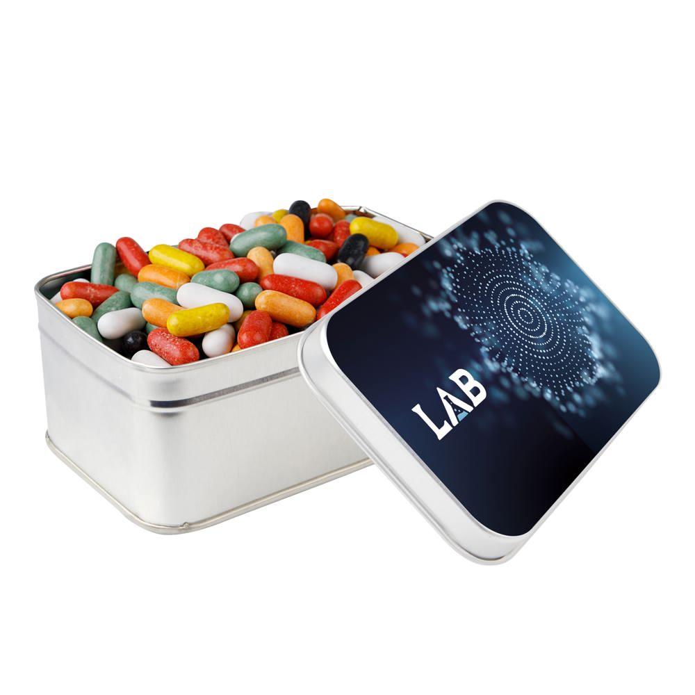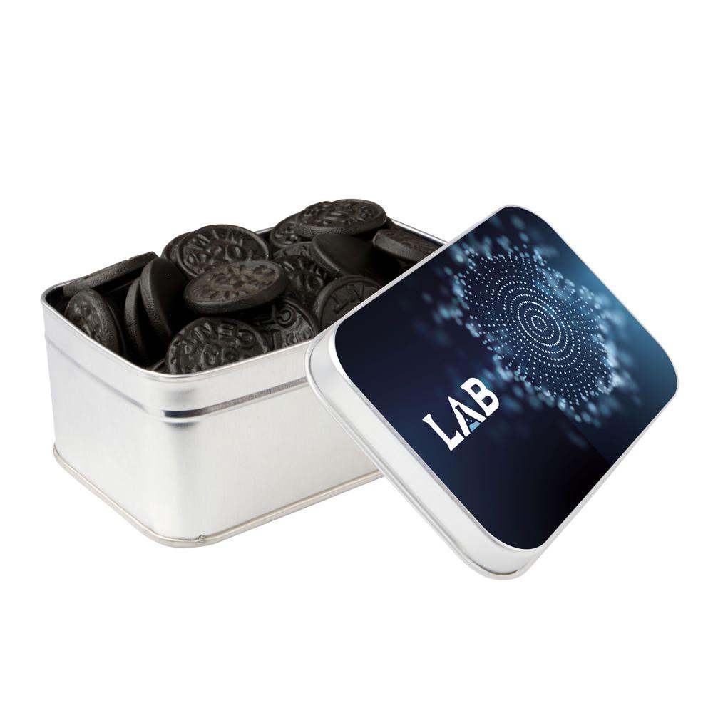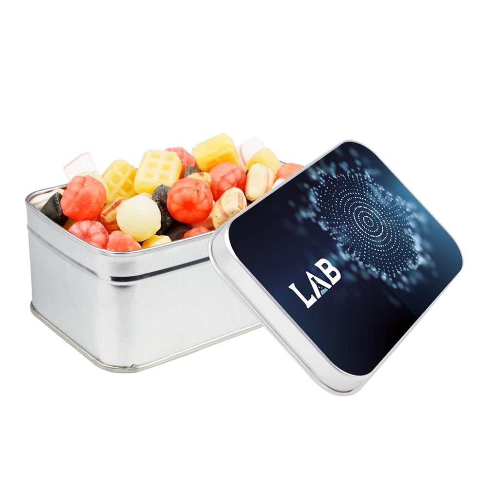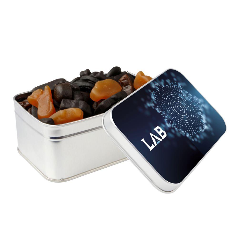 Elevate your brand with this sleek rectangular tin, filled with approximately 140 grams of delightful sweets. Featuring a high-quality full color print on the lid, it's perfect for showcasing your logo or custom design.