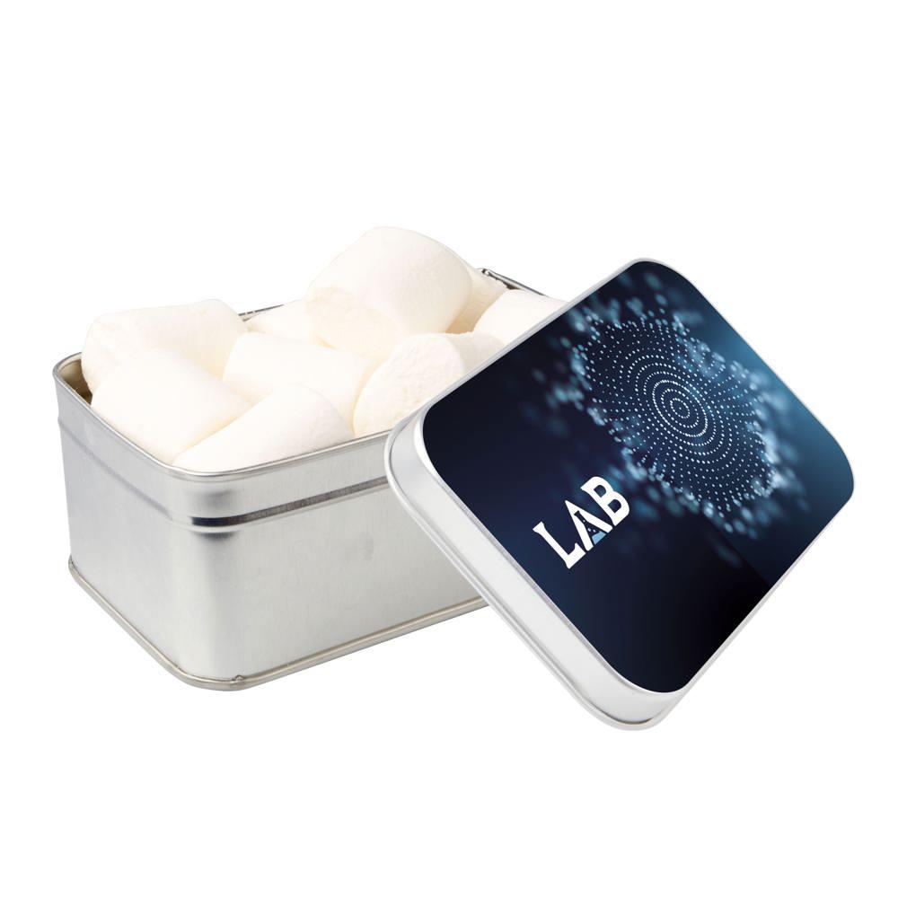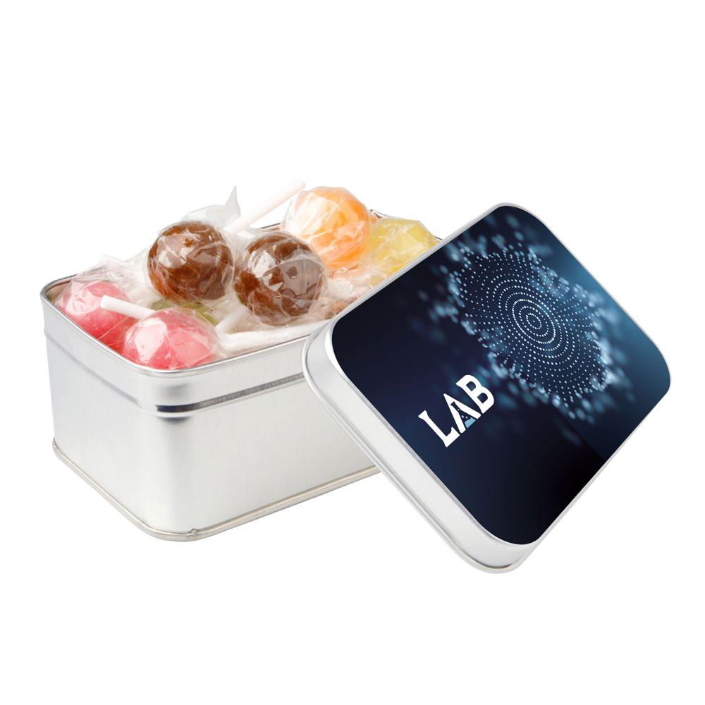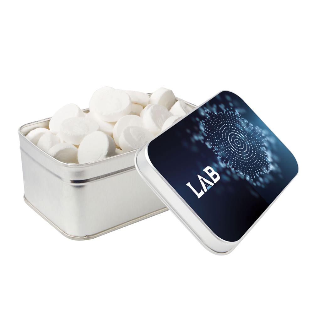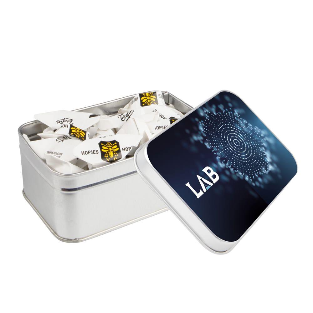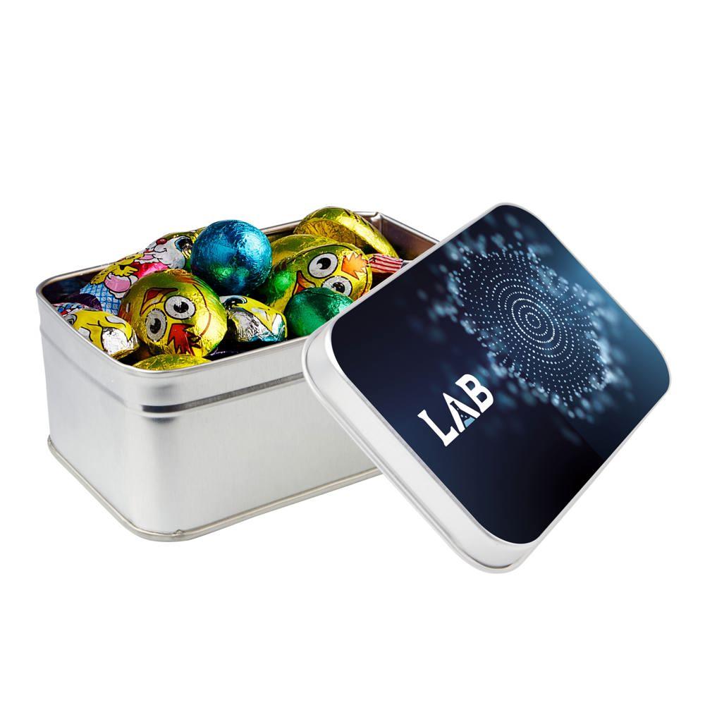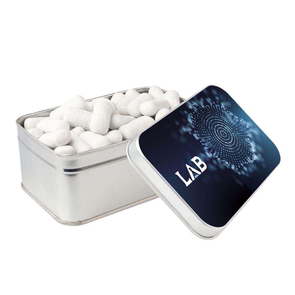 Elevate your brand with this sleek rectangular tin, filled with approximately 140 grams of delightful sweets. Featuring a high-quality full color print on the lid, it's perfect for showcasing your logo or custom design.