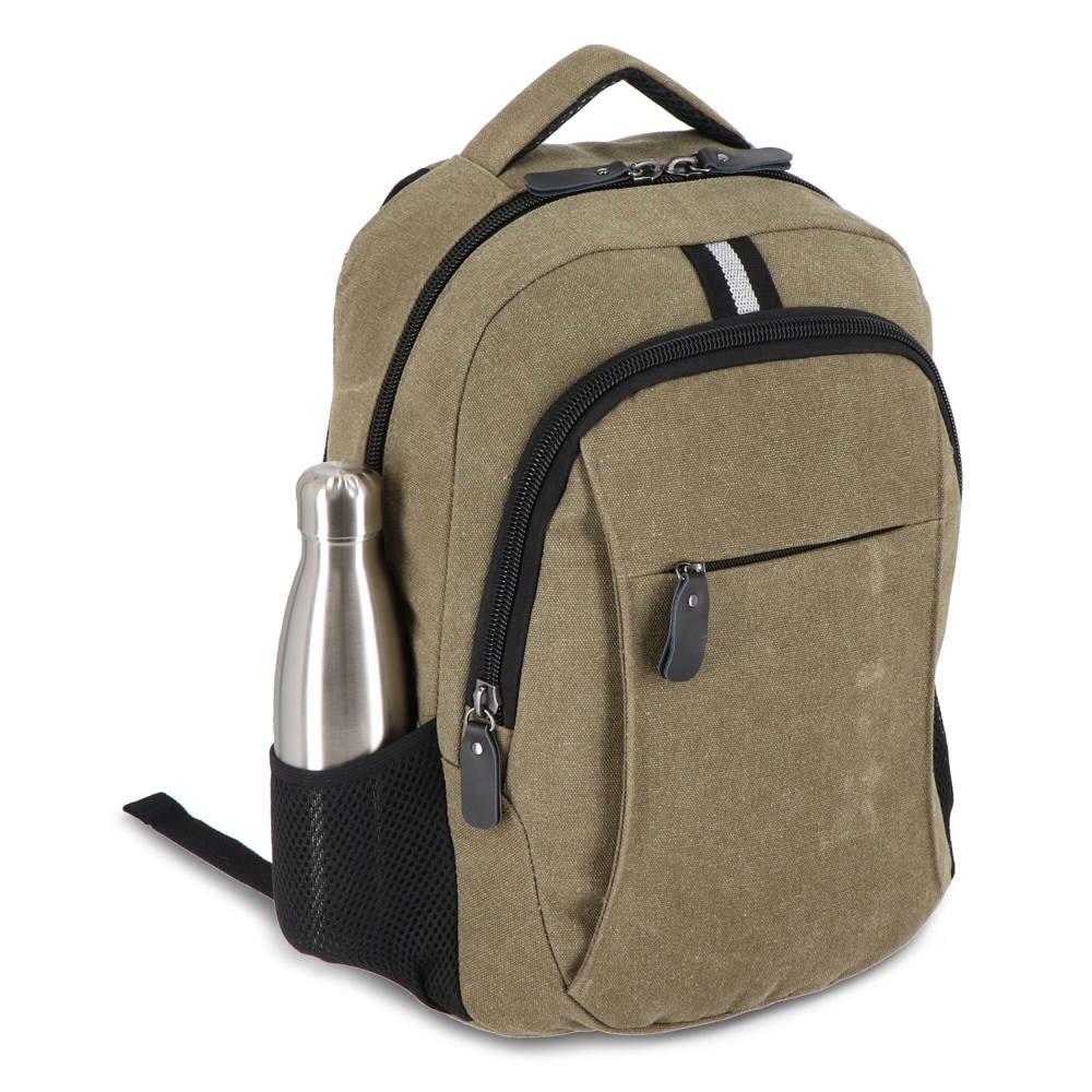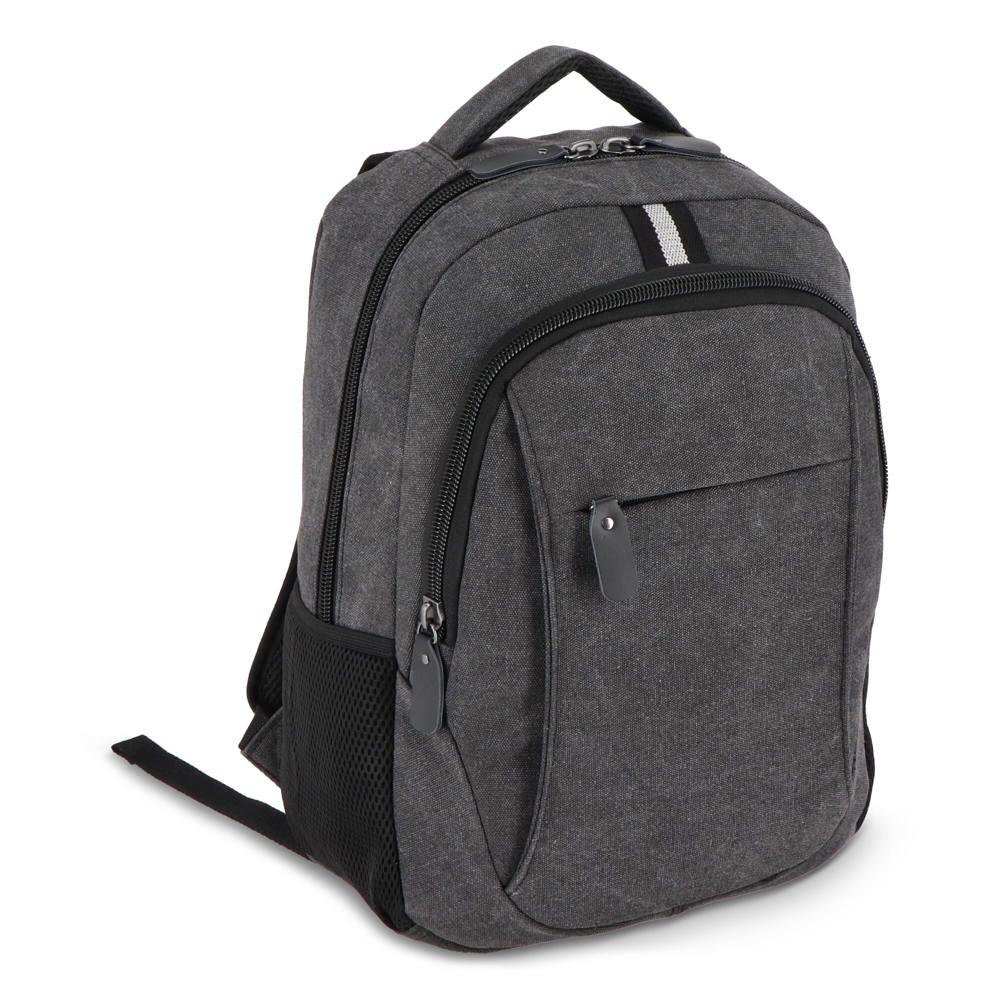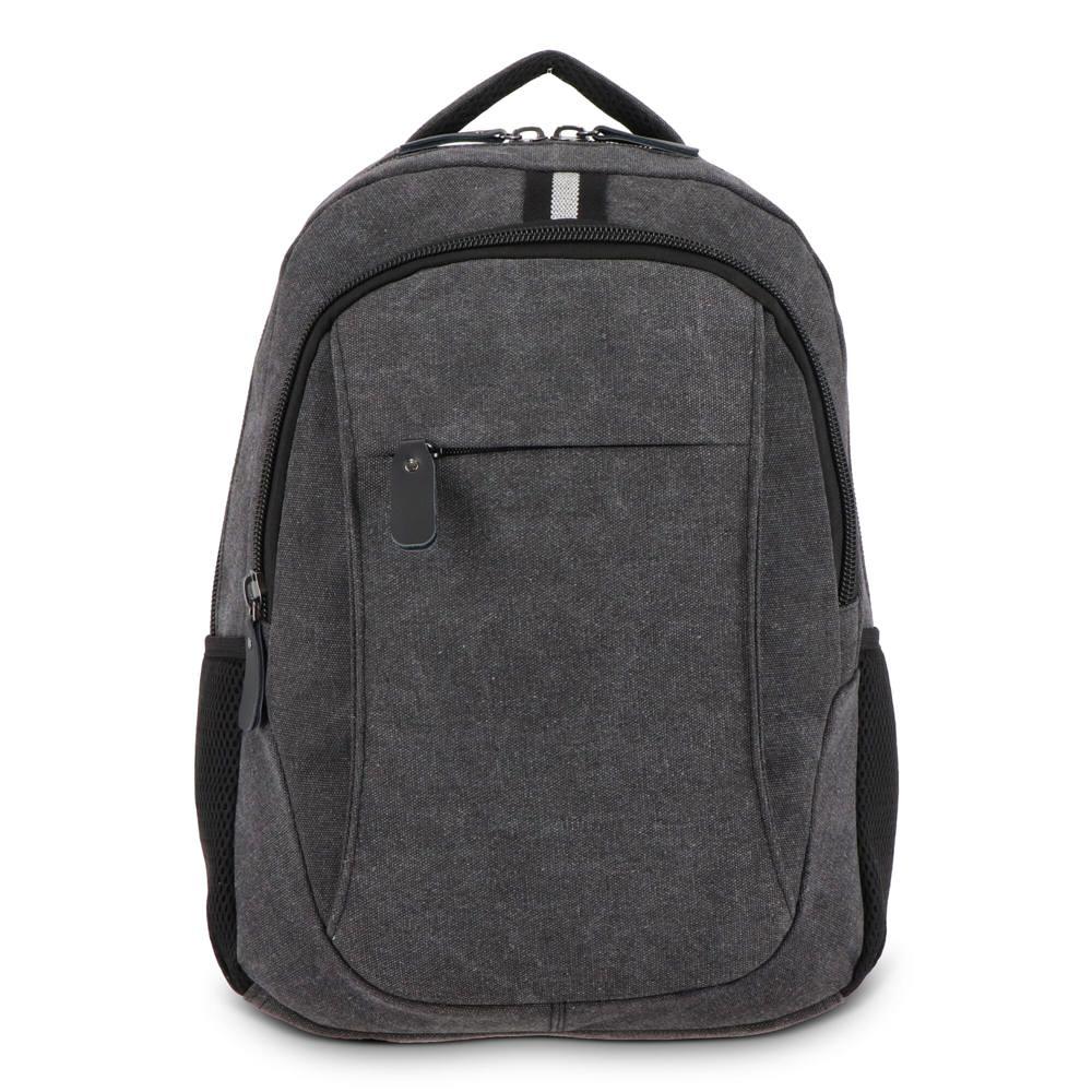 Practical design includes a padded back for comfort, grab handle, adjustable shoulder straps, two side pockets for bottles or umbrellas, a front pocket, and an interior laptop compartment—perfect for professionals on the go.