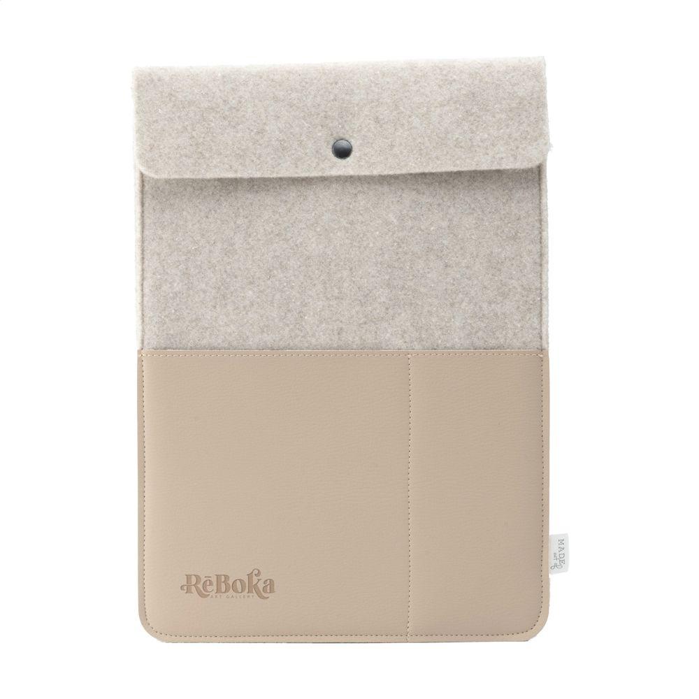 Handmade in Holland with Dutch design flair, this sleeve features a secure flap with press stud closure and two front pockets for accessories. Perfect for marketing professionals and event organizers seeking branded promotional gifts.