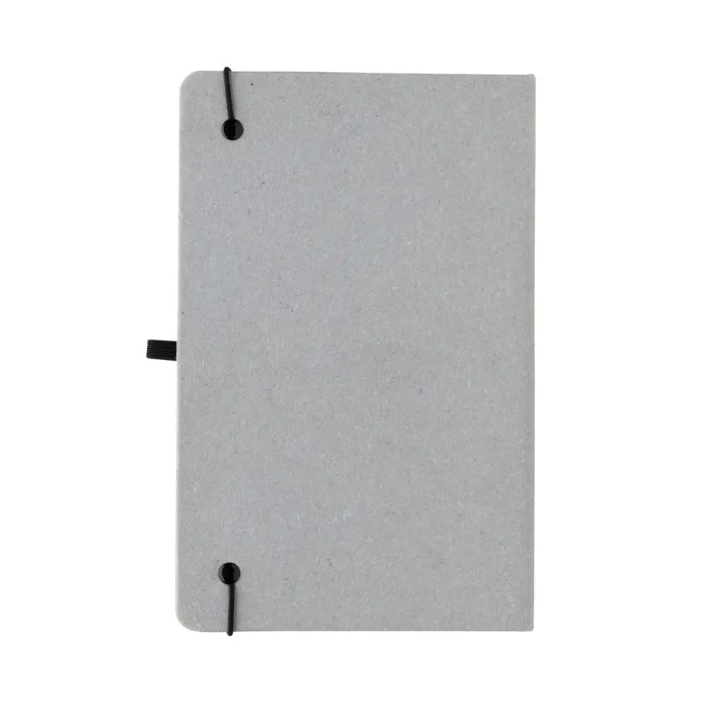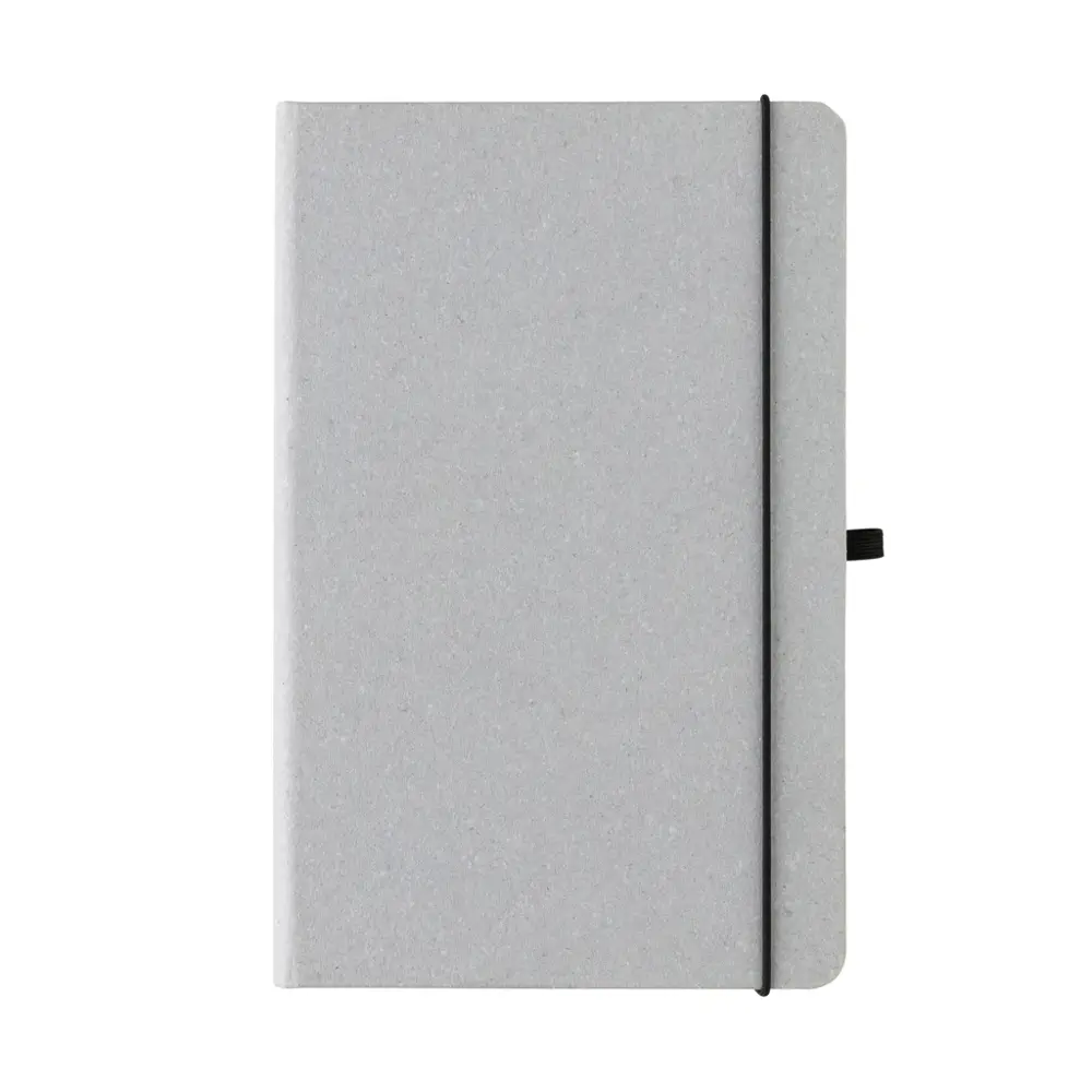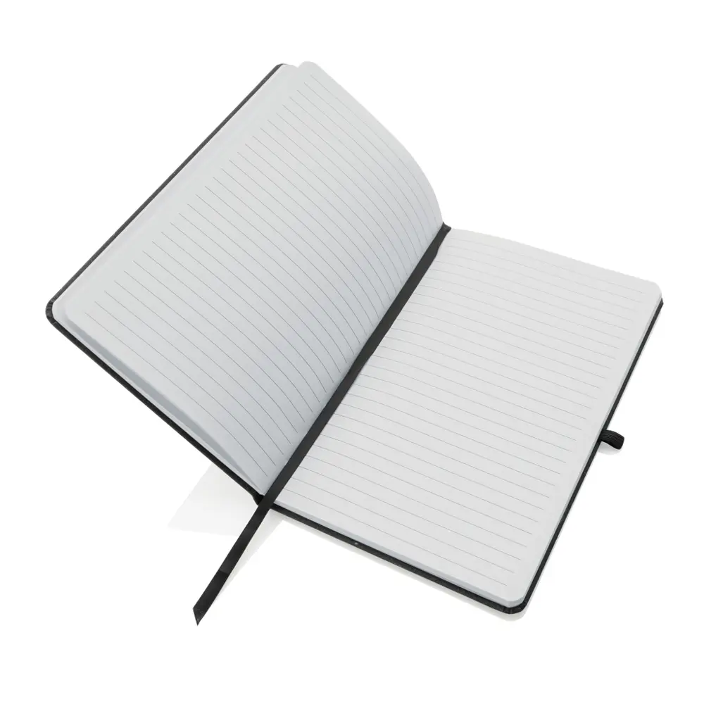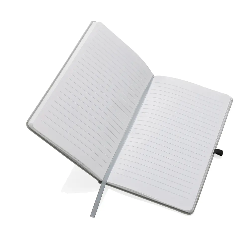 Elevate your brand with our GRS recycled leather hardcover notebook in A5 format, ideal for personalization with your logo as a premium corporate gift. Crafted from 77% recycled materials, including sustainable leather and 70 g/m² lined recycled paper, this notebook offers 160 pages for ample note-taking space, a vertical elastic closure, and a convenient pen loop.