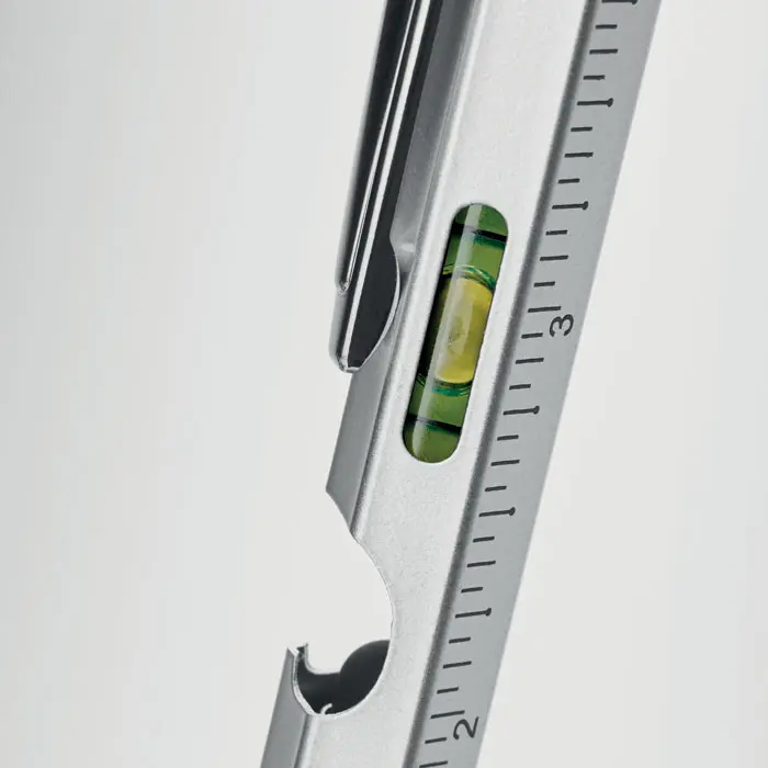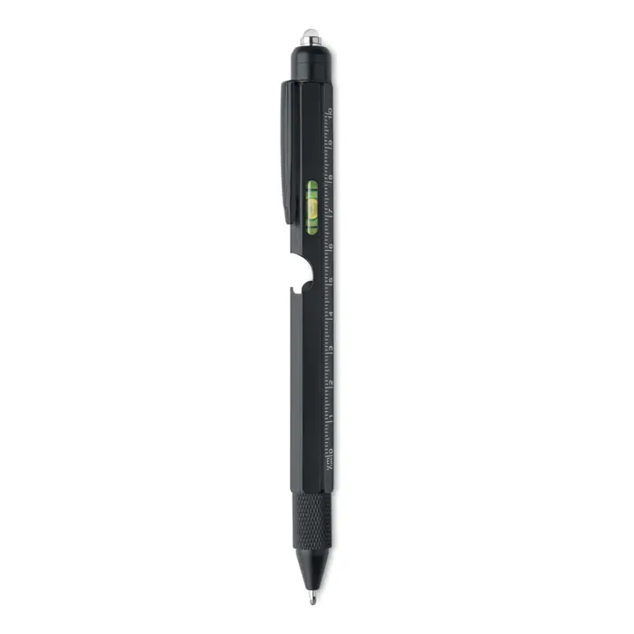 Elevate your promotional giveaways with this innovative twist-action pen that combines everyday writing with practical utilities. Crafted from durable aluminium, it features a built-in spirit level for quick measurements, a handy ruler for on-the-go reference, a stylus for touchscreen devices, and interchangeable Phillips head and flat head screwdriver bits for minor repairs. An integrated LED light ensures visibility in low-light conditions, while three AG batteries power it right out of the box. Refillable with blue ink for smooth writing.