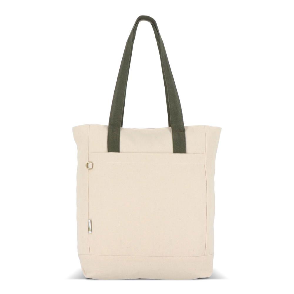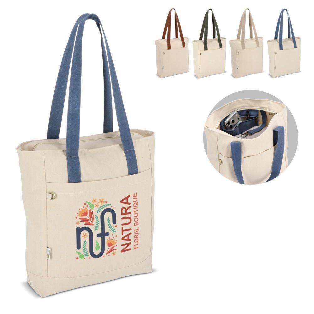 Practical features include a secure zipper closure, a lockable interior compartment for valuables, and a metal carabiner for keys, ensuring recipients stay organized on the go. This eco-friendly tote combines durability with responsible sourcing, helping marketing teams and event organizers deliver memorable, branded merchandise that promotes sustainability.