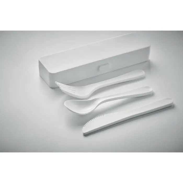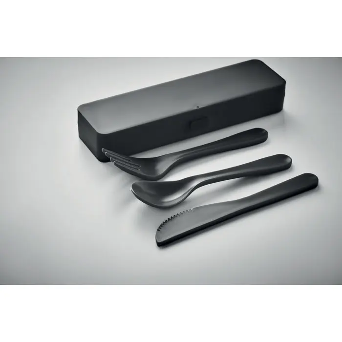 Elevate your brand with the RIGATA reusable PP cutlery set, a portable essential for eco-conscious promotions. Crafted from durable polypropylene, this compact set includes a spoon, fork, and knife, neatly stored in a convenient case for on-the-go use.