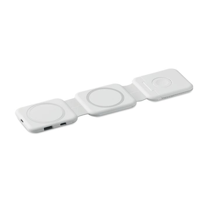 Elevate your brand with this versatile foldable charging station, perfect for marketing professionals and event organizers seeking high-impact promotional gifts. Crafted from durable ABS with magnetic design for secure device placement, it features three wireless charging spots: a powerful 15W spot for smartphones, a 5W option ideal for TWS earbuds, and a dedicated 3W charger for Apple Watch.