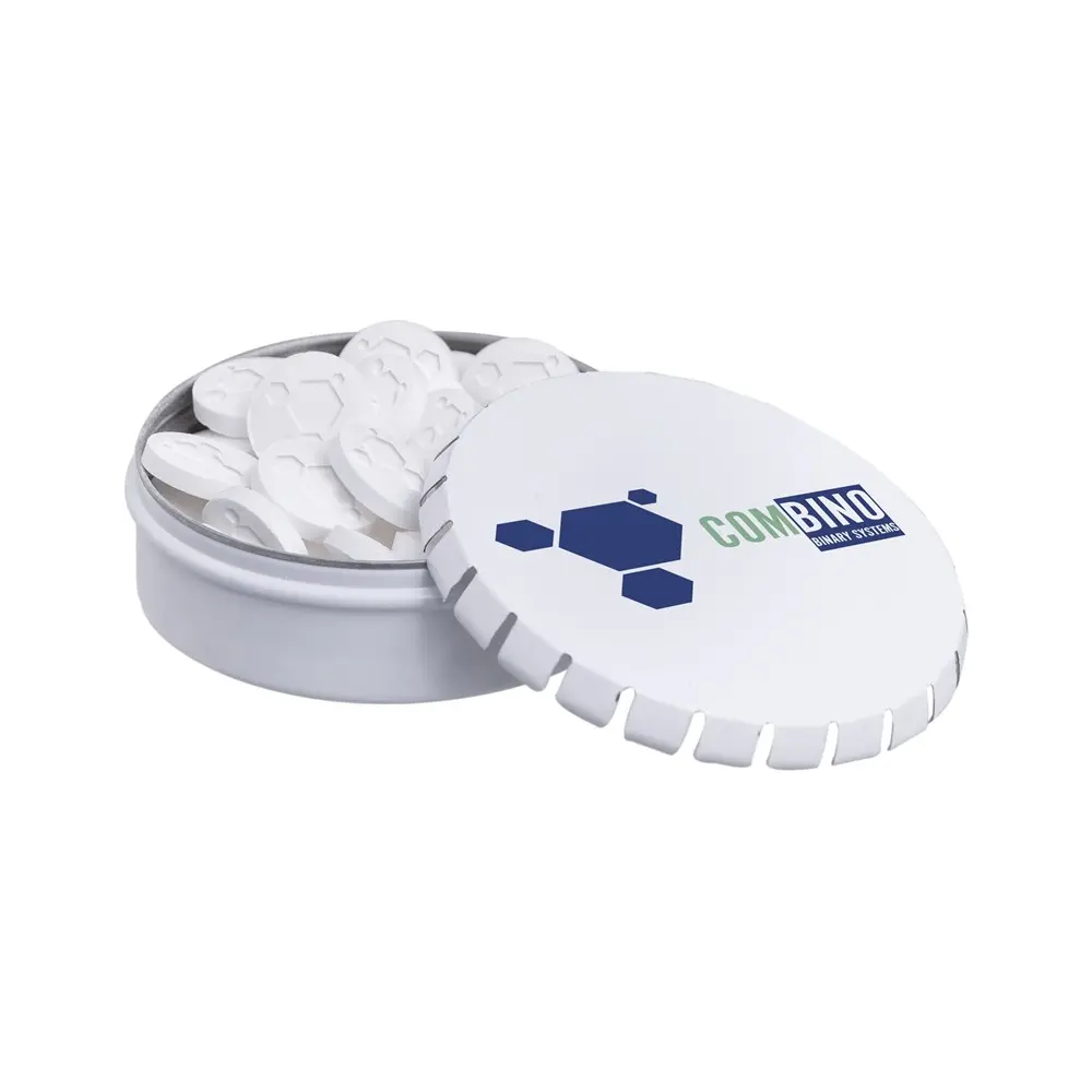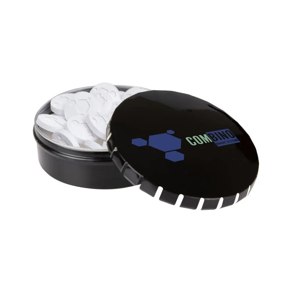 Elevate your brand with our Round Tin Logo Mints, a compact and stylish promotional essential. Crafted from durable tin with a secure clic-clac lid, this 78mm diameter tin holds approximately 50 grams of custom logo-shaped mints, perfect for freshening breath on the go.