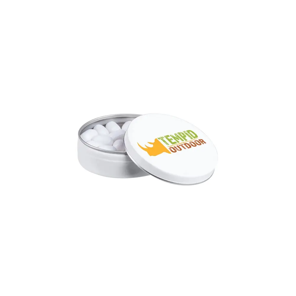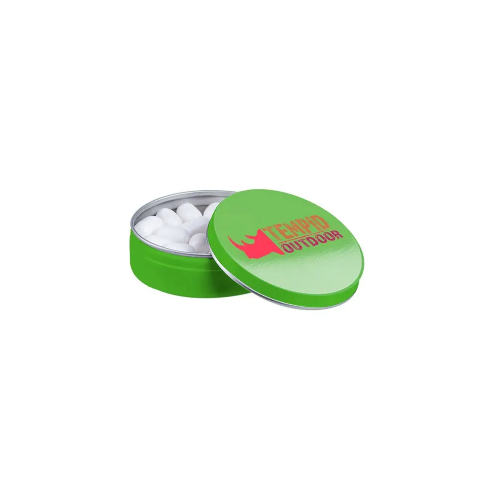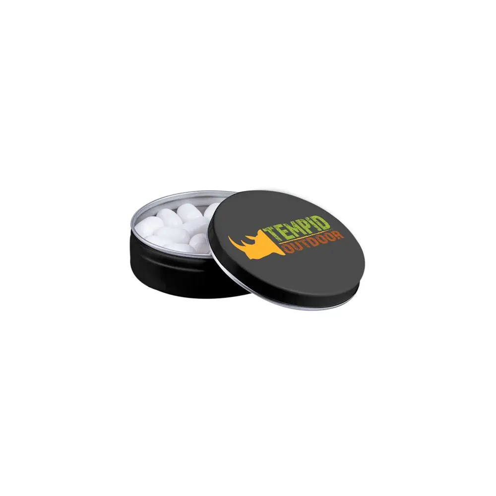 Elevate your brand's visibility at events and client meetings with this compact round tin, perfect for personalization. Filled with approximately 18 grams of refreshing Tic Tac mints, it offers a delightful touch to your giveaways.