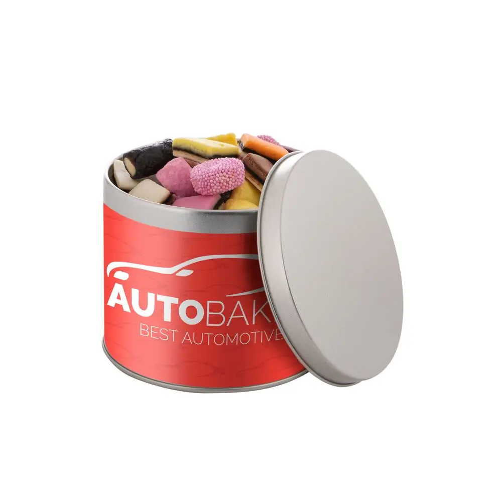 Elevate your brand's visibility with this versatile 0.6 liter round tin, meticulously crafted from durable tin material with a 100mm diameter. Pre-filled with approximately 475 grams of delightful licorice sticks mix, it serves as an irresistible treat that keeps your logo in mind long after the event.